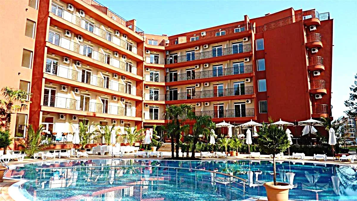 📍 Комплекс расположен в юго-западной части курорта — тихом, утопающем в зелени районе, при этом остающемся в пешей доступности от центральной части Солнечного Берега. До пляжа Какао Бич и моря — около 700 метров. Прогулка до круглогодично работающего супермаркета «Младость» занимает не более 15 минут, до овощного рынка — около 5 минут.
