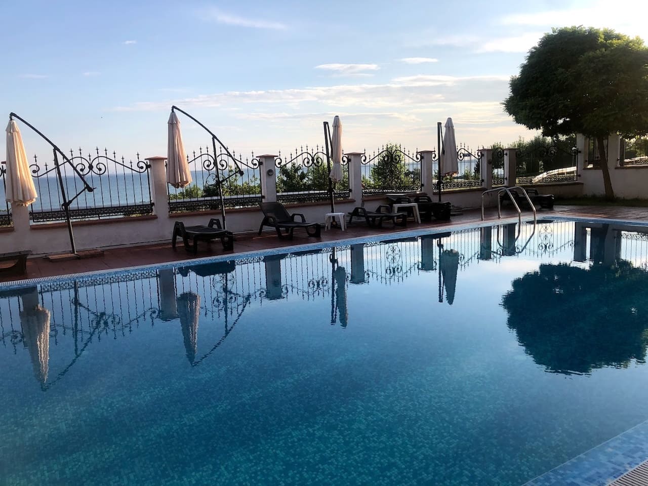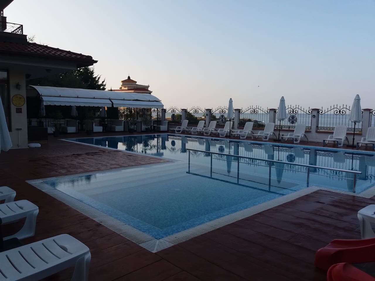 Сезонный открытый бассейн с детской секцией, шезлонгами и зонтиками.