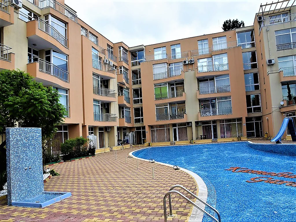 Предлагаем на продажу меблированную студию в комплексе «Камелия Гарден», Солнечный берег, площадью 47м2, 4 этаж, с видом на бассейн. Такса поддержки 380 евро в год. «Камелия Гарден/Kamelia Garden» — современный комплекс апартаментов расположен в центральной части курорта Солнечный Берег. Этот район один из самых спокойных и тихих на Солнечном Берегу. До пляжа 7 минут пешком, в шаговой доступности магазины, рестораны, бары, развлекательные центры, банк, поликлиника и полиция, остановки общественного транспорта. В 2 минутах ходьбы супермаркеты «Перла” и «Младост», недалеко крупнейший аквапарк Action.