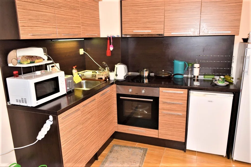 В курорте Святой Влас предлагается к продаже просторная трехкомнатная квартира с видом на бассейн. Апартамент находится на втором этаже комплекса Мэджик Дримс и включает : гостиную с зонами обеда и отдыха, небольшую прихожую, две уютных спальни, санузел с ванной и открытый балкон. Есть вся необходимая техника. Общая площадь 109 кв. м.( застроенная площадь 91 кв.м.) В числе удобств, предлагаемых для владельцев недвижимости, есть бассейны с шезлонгами, парковка, парковая зона с обильным озеленением и стойка ресепшн. Территориально комплекс расположен между Солнечным Берегом и центральной частью Святого Власа, в уютном и лишенном туристической суеты месте. Чистый пляж – в 250 метрах.