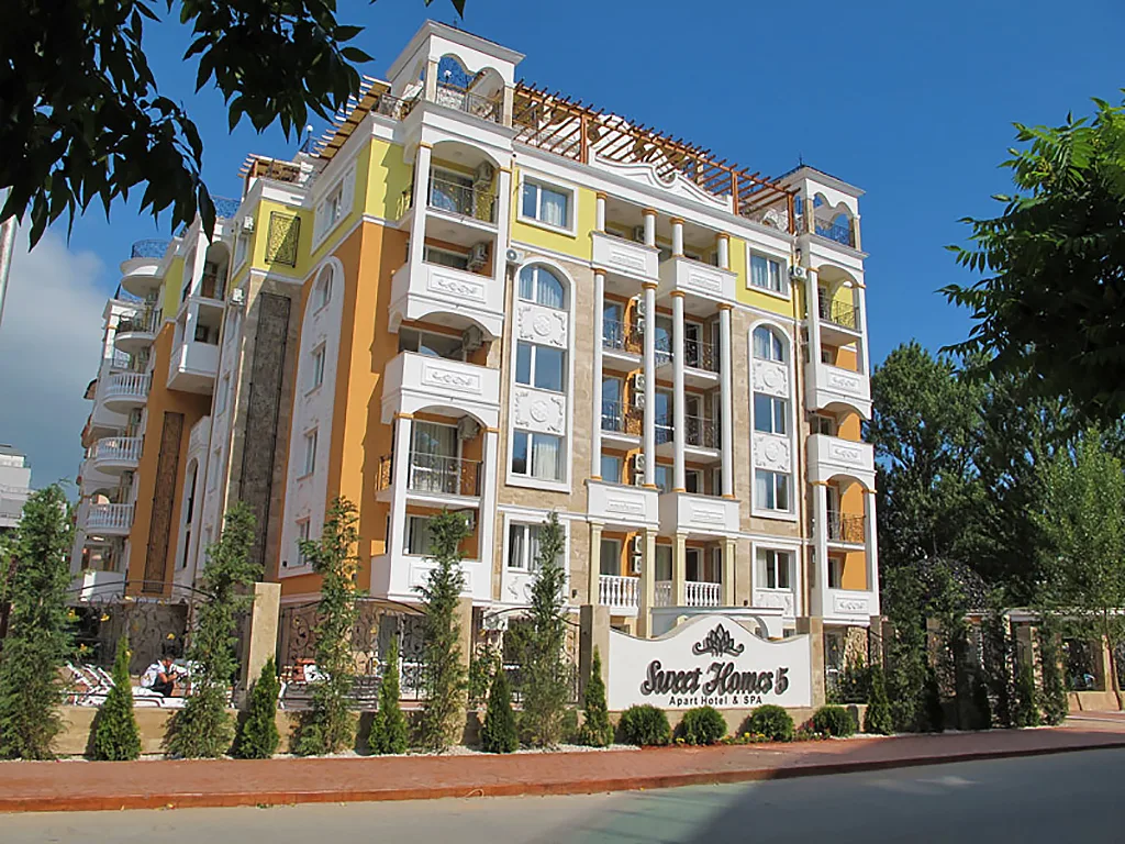 В комфортабельном, современном и удобно расположенном комплексе Свит Хоум 5 предлагается к продаже двухкомнатная квартира. Это – прекрасно меблированный апартамент, уже готовый к заселению или сдаче в аренду. На площади в 61,83 кв. м. есть абсолютно все удобства: современная и качественная мебель, бытовая техника, интерьерные элементы. Сделан отличный и оригинальный ремонт (авторский дизайн-проект). Квартира находится на втором этаже здания. Комплексы Свит Хоум – это один из лидеров курортной недвижимости на Солнечном берегу. Он построен в центральной части курорта, примерно в 400 метрах от побережья. На внутренней территории работает СПА-центр, фитнес-зал люксового класса, есть большой бассейн с водяными эффектами, круглосуточно работает ресепшн. Окрестности зеленые, много мест для прогулок и отдыха.