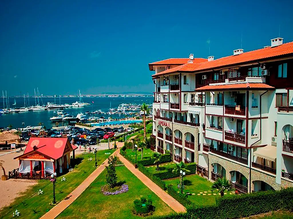Предлагается к продаже компактная двухкомнатная квартира на первой линии от моря в Святом Власе. Рядом с комплексом «Арена 1» находится яхт-порт, можно вечером прогуляться по набережной, насладиться природой и закатом, а также поужинать в одном из ресторанов. Апартамент с одной спальней, полностью меблирован. Застроенная площадь 66 кв.м. Жилье находится на третьем этаже из окон и террасы открывается панорамный вид на море и набережную. В шаговой доступности находится амфитеатр ( на его территории проходят занятия для детей, концерты и пр.), СПА-салон, продуктовый магазин, медицинский кабинет, церковь, автобусная остановка, овощные палатки, павильоны быстрого питания. Такса поддержки за общие части здания составляет 600 евро в год.