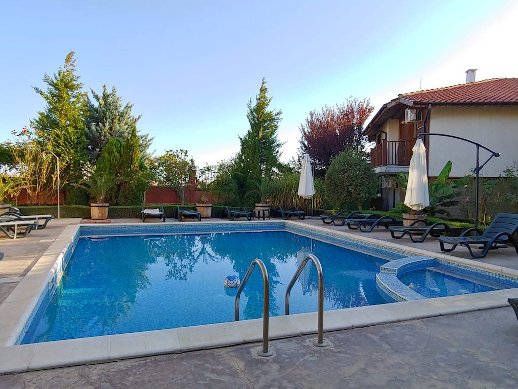 Предлагается к продаже отличный – таунхаус с видом на море, всего в 2 км. от пляжа Солнечного берега! Таунхаус находится в комплексе с закрытой и охраняемой территорией в курорте Кошарица, Солнечный Берег. Кошарица расположен у подножия горы «Стара планина», в непосредственной близости к заповеднику «Калината». Местность знаменита красивейшей природой, спокойствием и чистым воздухом. В районе есть вся необходимая инфраструктура: магазины, рестораны, кафе, автобусная остановка. Недвижимость площадью 151 кв.м, расположена на земельном участке площадью 283 кв.м., состоит из: первый этаж - просторной веранды, прихожей, санузла, большой гостиной с кухонной и столовой зонами. Из гостиной есть выход на открытую террасу и территорию. На втором этаже: 3 просторные спальни, 2 санузла, один из которых с ванной, другой с душевой кабиной и две террасы с видом на море и горы. Выход на террасы есть из каждой спальни. Дом полностью оснащен всем необходимым для комфортного проживания: мебель, техника, текстиль, посуда, кондиционеры, интернет и телевидение. Парко место. Инфраструктура комплекса: Бассейн с детской зоной, зонтиками и лежаками . Круглогодичная охрана, видеонаблюдение. Частный паркинг. Зона барбекю . Детская площадка. Ландшафтное озеленение. Есть Акт 16, годовая такса обслуживания : 8 € /кв.м.