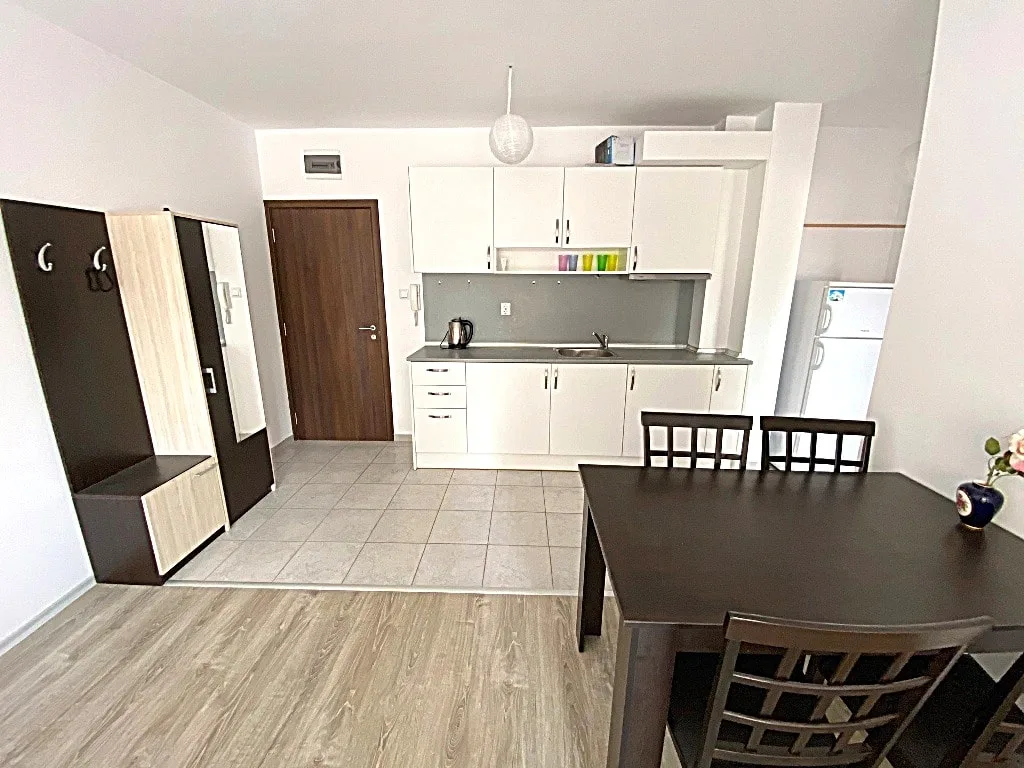 Предлагается к продаже двухкомнатная квартира в комплексе "Golden Eye". Жилье расположено на партерном этаже здания комплекса (есть лифт). Общая площадь квартиры 57,37 кв.м. (жилая – 48,24 кв.м.). Квартира состоит из прихожей, гостиной с кухонным боксом, просторной спальни, совмещенного сан. узла с душевой кабиной, балкона с видом на территорию комплекса. Квартира уютная и светлая. Установлен один кондиционер в гостиной. Пол - ламинат. Продаётся с мебелью и бытовой техникой. Комплекс расположен в 250 метрах от центра города и в 700 м. от пляжа. Инфраструктура комплекса:• лифт, • ресторан, • бассейн с шезлонгами, • места для отдыха, • подземный паркинг, • СОТ охрана, • поддержка по обслуживанию комплекса, • годовая поддержка: 10 Евро/кв.м. Благодаря своему местоположению и близости к городской инфраструктуре комплекс отлично подходит для круглогодичного проживания и отдыха. В шаговой доступности находится медицинский центр, автобусная остановка и центральная площадь Святого Власа, где расположены различные магазины, кафе, рестораны, супермаркеты.