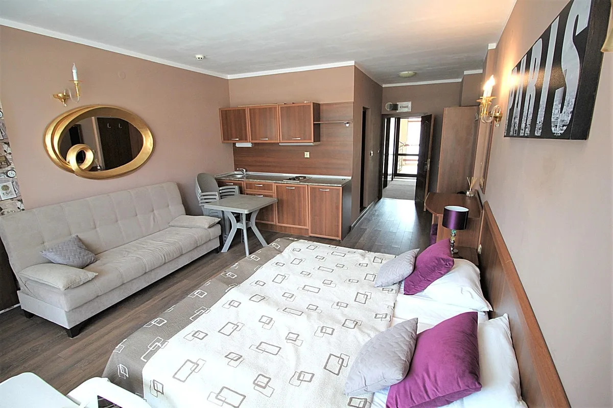 Шикарная квартира – студия общей площадью 48 кв. м., расположенная на втором этаже в комфортабельном апарт - отеле «Гренада» на первой береговой линии от моря, в непосредственной близости от популярного пляжа Какао-бич, в южной части Солнечного берега, в пешей доступности до города Несебра, стадиона и госпиталя. Это идеальный вариант для прекрасного отдыха в Болгарии