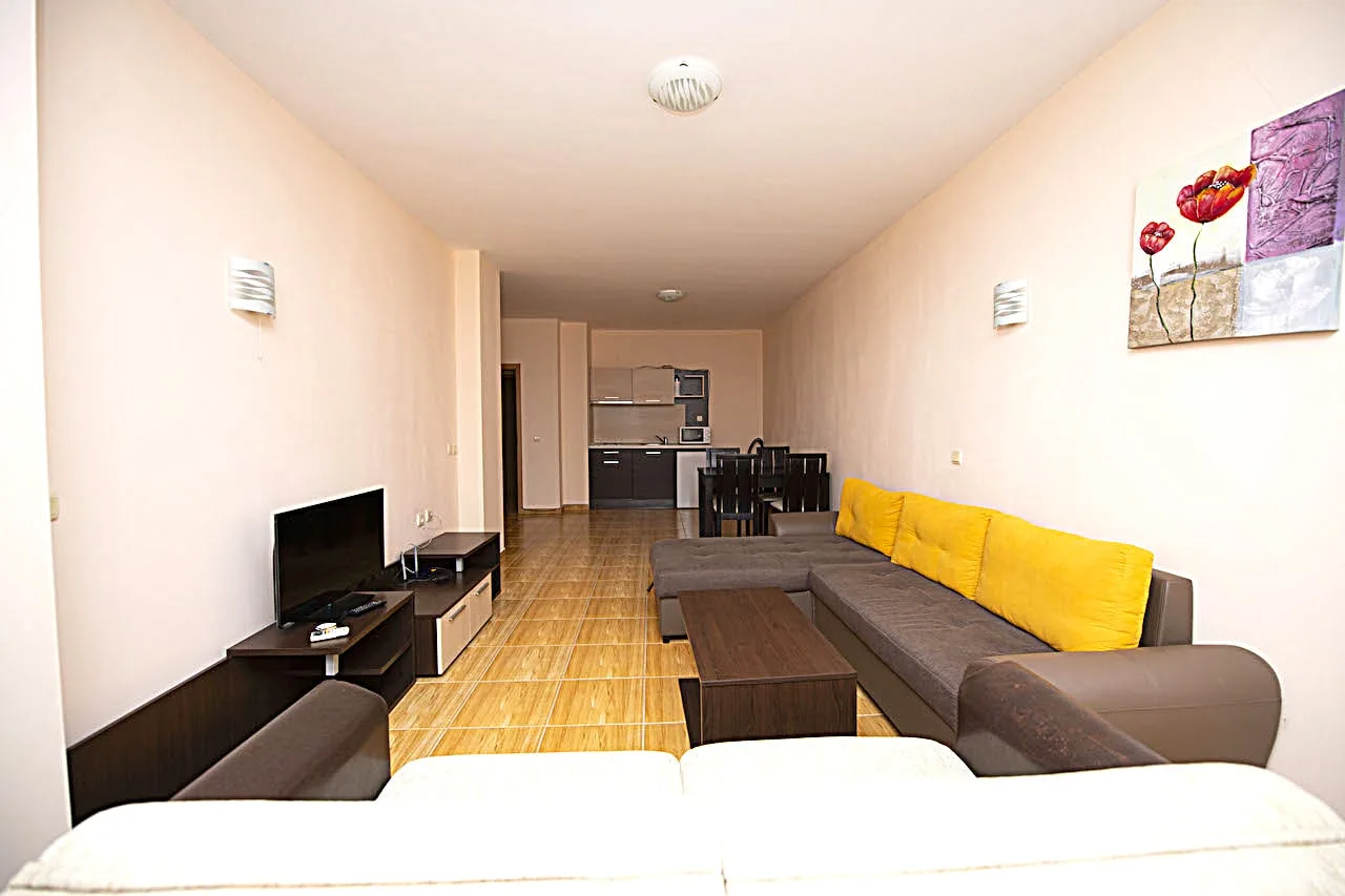 На территории комплекса «Мэджик Дримс» к услугам собственников недвижимости : есть два больших бассейна, детская площадка, парковка, ресторан, фитнес-зал и рецепция (можно заказать уборку, трансфер, экскурсии и пр.). Такса поддержки существенно ниже, чем в других комплексах такого типа и составляет всего 8 евро за 1 кв.м. площади. Предлагаемый к продаже апартамент расположен на пятом этаже и занимает общую площадь 78,26 кв.м.