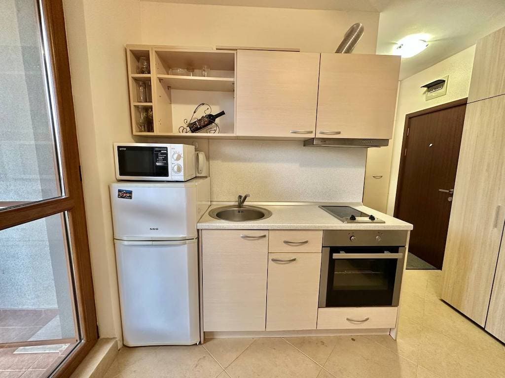 В апарт - комплексе Каскадас 4, в центральной части Солнечного берега, предлагается к продаже квартира-студия площадью 32,0 кв. м. Жилье располагается на четвертом этаже здания, оно полностью меблирована и готово к проживанию новых собственников. Есть вся техника, а также кухонная утварь и хозяйственный инвентарь. С балкона открывается вид на территорию комплекса. Богатый с инфраструктурной точки зрения комплекс – настоящий рай для комфортного проживания. Расположенный на второй линии от моря, Каскадас предусматривает полный спектр удобств для локального отдыха. На его территории есть несколько бассейнов, детский сад с няней, мини- аквапарк, спортивные центры, и еще более десятка развлекательных локаций.