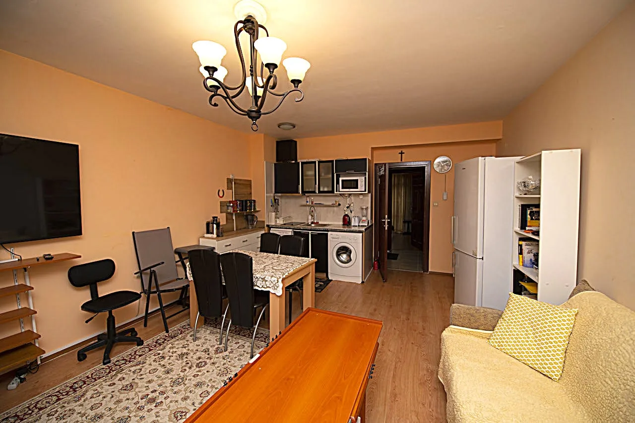 Предлагаем Вашему вниманию меблированную двухкомнатную квартиру общей площадью 77,43 кв.м., расположенную на пятом этаже в комплексе „Антарес”. Комплекс находится в 600 метрах от пляжа Солнечного Берега. В районе развита инфраструктура: автобусная остановка, рестораны, магазины, супермаркеты, аптека, обменные пункты валют и многие другие услуги для Вашего комфорта.