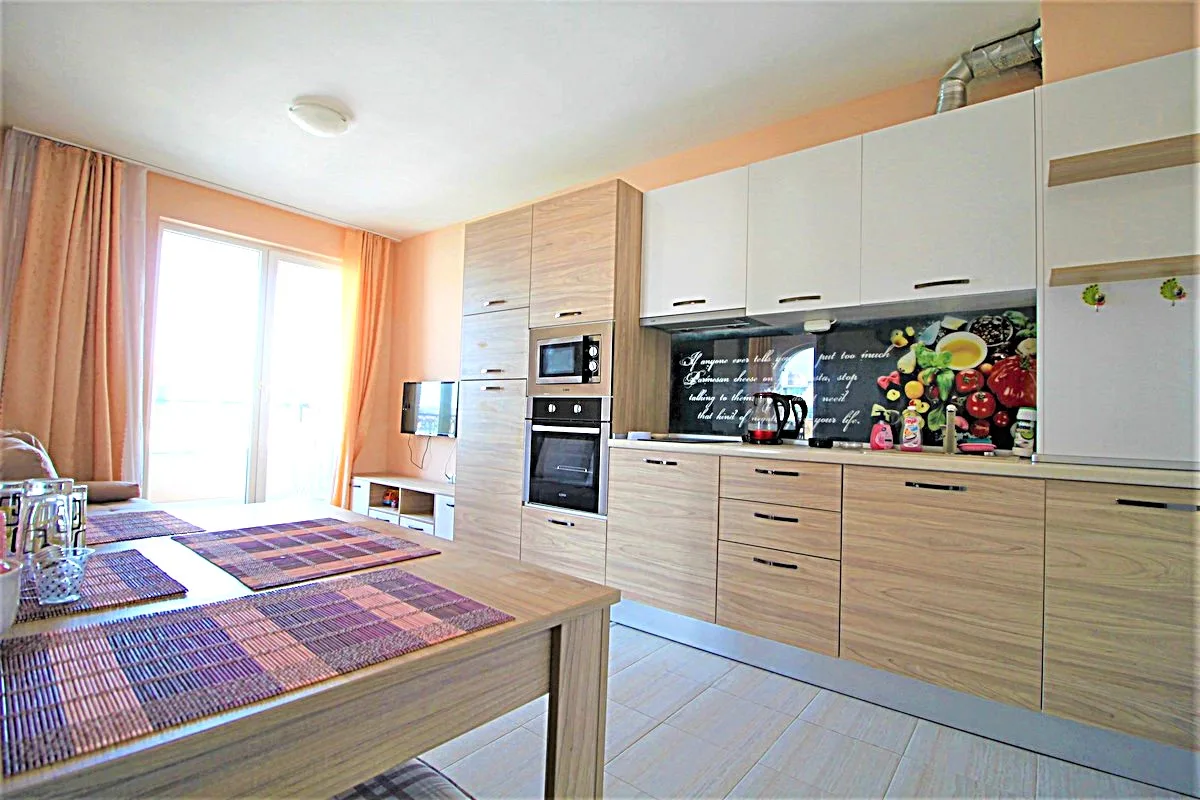 Новое предложение в Солнечном береге! Двухкомнатная квартира на пятом этаже в комплексе Мессембрия Резорт! Предлагается к продаже прекрасно обустроенный апартамент общей площадью 53 кв. м. Квартира со светлым, современным дизайном интерьера, большой кухней и качественной мебелью. В спальне красивые полукруглые окна, есть большая терраса. Мессембрия Резорт построен в Солнечном береге и по праву может считаться одним из лучших комплексов курортных апартаментов. Комплекс располагается между кварталами Фрегата и Стадион, в десяти минутах ходьбы от пляжа. Мессембрия Резорт работает круглогодично и предлагает жильцам отличный сервис и разнообразные удобства. В их числе бассейн, ресторан, детскую площадку.