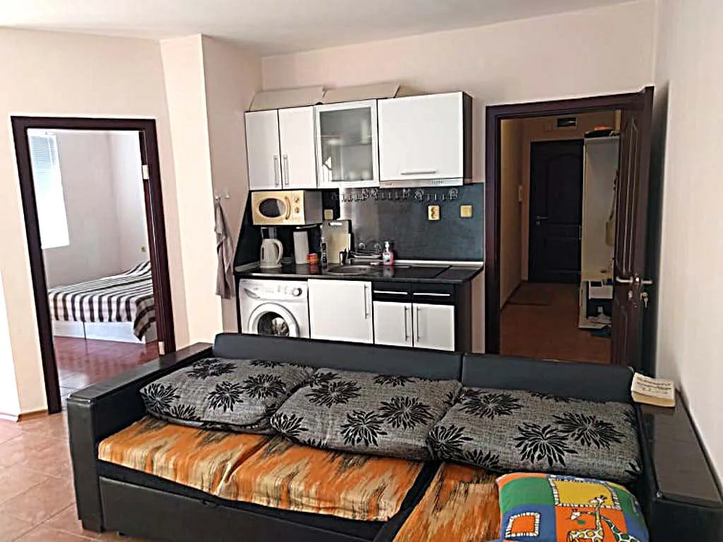 В курорте Солнечный Берег к продаже предлагается двухкомнатная квартира на втором этаже комплекса Марак 1. Общая площадь составляет 63.63 кв.м., она разделена на гостиную с кухонной зоной, спальню, ванную комнату и террасу. Окна гостиной выходят на бассейн и внутренний двор. Продажа с мебелью и техникой . В обеих комнатах установлен кондиционер. Апарт - комплекс Марак 1 находится менее чем в километре от пляжа, а центр курорта с разнообразием развлечений и услуг находится примерно в километре. В пешей доступности – супермаркет Младость. На территории есть бассейн с секцией для детей и зоной для отдыха