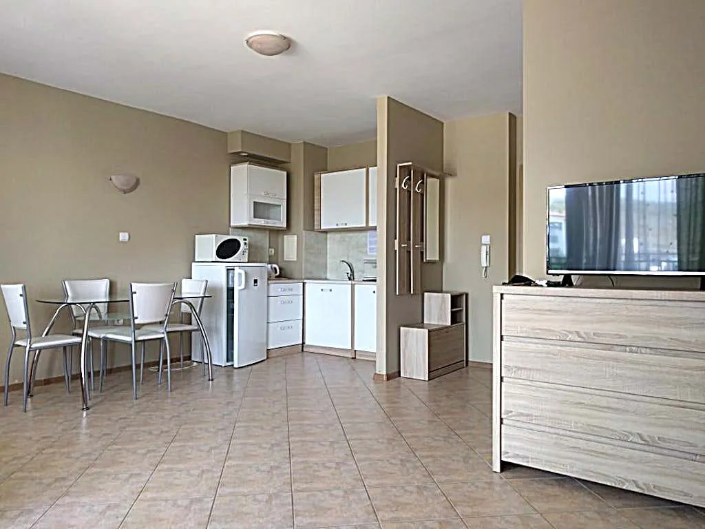 Предлагается на продажу квартира в курорте Солнечный Берег. Студия расположена в благоустроенном жилом комплексе "Санни Бич Хиллс". Комплекс находится в северной части курорта Солнечный Берег рядом со Святым Власом. Рядом находятся элитные комплексы «Хелена Резорт» и «Виктория Палас». Из комплекса "Санни Бич Хиллс" открывается красивая панорама на горы Стара Планина. «Санни Бич Хиллс» - это комплекс из двух семиэтажных зданий. В каждом подъезде установлен современный лифт. Территория комплекса облагорожена и озеленена. Внутренняя инфраструктура: ресепшен, лобби-бар, 2 открытых бассейна для взрослых и детей, пул-бар, игровая площадка. Парковка, круглосуточная охрана и видеонаблюдение. Квартира представляет собой большую студию. Площадь квартиры составляет 51 кв.м. Удобная и практичная планировка. Квартира продается с обстановкой. Четвертый этаж .