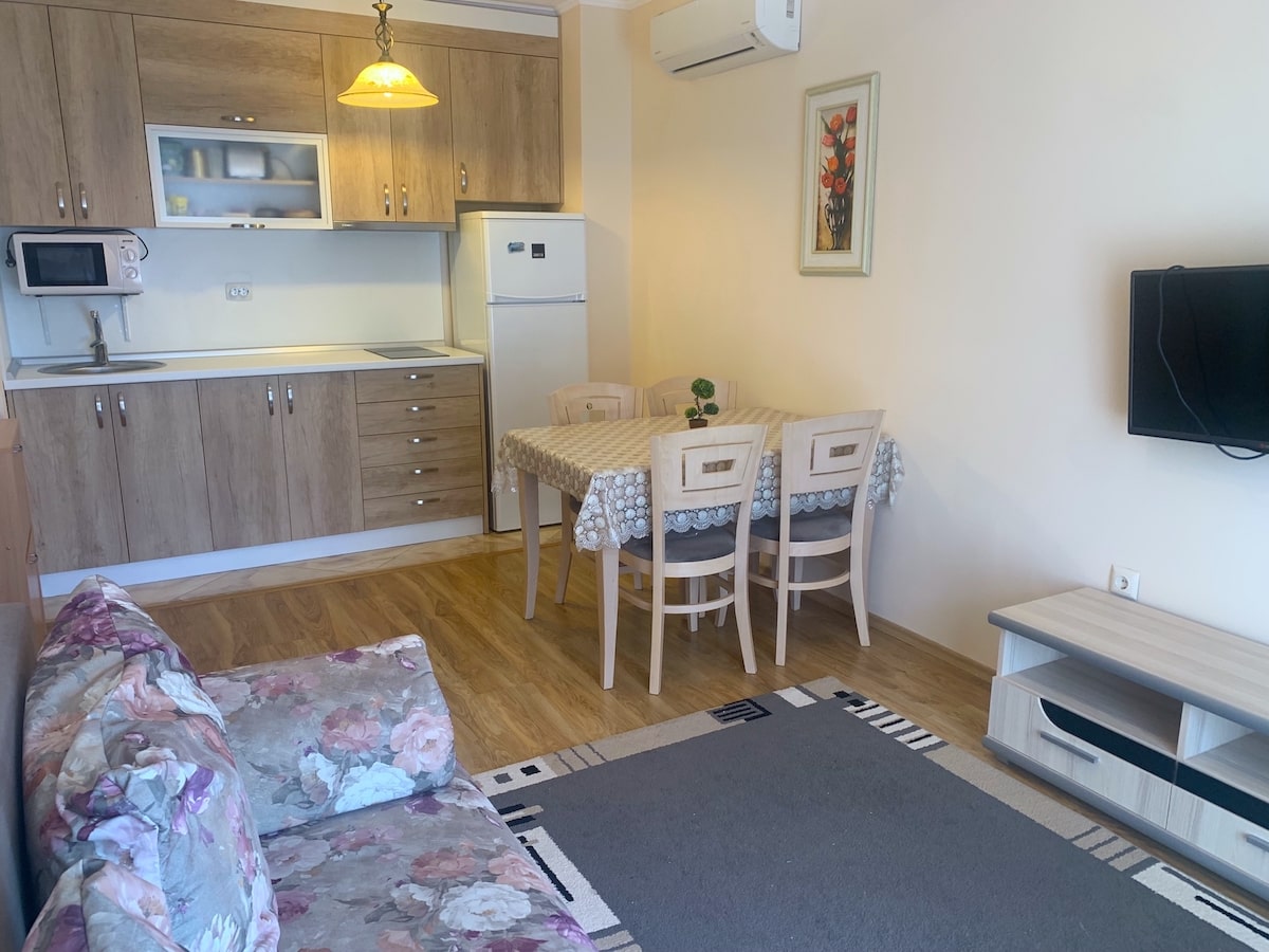 Предлагается к продаже уютная меблированная двухкомнатная квартира в шикарном жилищном комплексе Венера Палас. Квартира с одной спальней, ее общая площадь составляет 60 кв. м. Из гостиной, оборудованной кухонным боксом, есть выход на террасу с видом на прилегающую территорию. Апартамент адаптирован как для летнего отдыха, так и круглогодичного проживания. В стоимость входит новая мебель и пакет современной техники, выполнен качественный и добротный ремонт. Территория комплекса гармонично разделена на зоны для активного и расслабляющего отдыха. Есть бассейн, парковые насаждения, площадки для занятий спортом и детских игр и многое другое