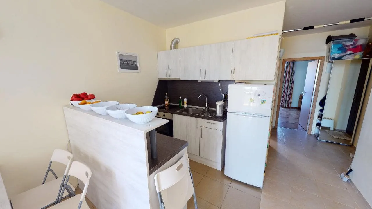 Недорогая новинка с видом на бассейн – в закрытом комплексе в Кошарице! Предлагается к продаже двухкомнатная квартира, общая площадь которой составляет 64 кв.м. Апартамент на первом этаже, с террасы открывается красивый вид на бассейн и территорию комплекса. Полный комплекс мебели и техники уже установлен, спальня оборудована под детскую комнату. Апартамент в прекрасном состоянии, есть все необходимое для жизни. На территории комплекса Голден Ай есть открытый бассейн, паркинг, игровая площадка для детей. Можно прогуляться по аллеям, засаженным зеленью, а также отдохнуть в баре. До Солнечного Берега около четырех километров, неподалеку есть автобусная остановка