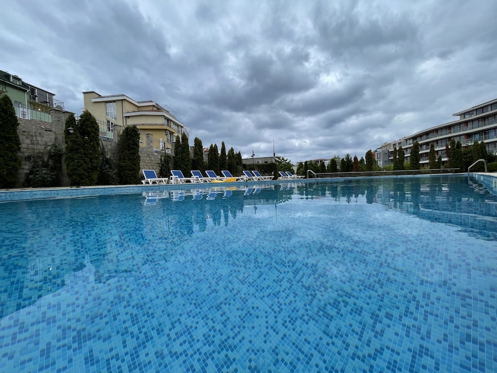 На партерном этаже комфортабельного курортного комплекса Сан Уэйв – нового проекта в Святом Власе – продается трехкомнатная квартира .Такая внушительная площадь в 105 кв. м. совместила в себе максимум полезного пространства: в квартире два санузла, есть две просторных террасы, с которых есть выход на территорию комплекса и на собственный дворик. Апартамент практически новый – никогда не сдавался. Продажа осуществляется с полным комплектом мебели и бытовой техники. Комплекс курортных апартаментов Сан Уэйв построен в спокойном районе Святого Власа. Просторная и красиво озелененная территория непосредственно граничит с пляжем – до песчаной полосы всего пятьдесят метров. Он находится в восточной части города, в квартале Юрта. На территории есть паркинг, бассейн, сад, и зоны отдыха