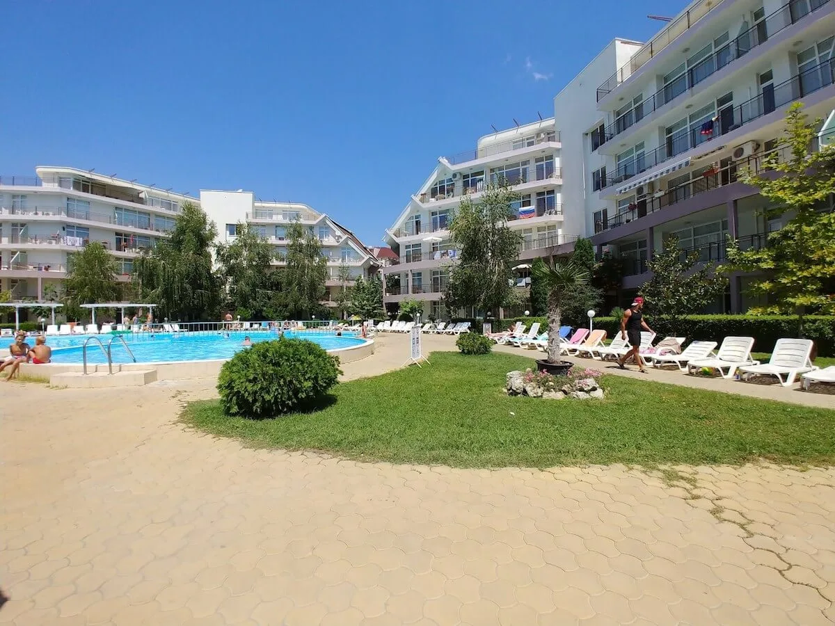 Топовая цена для отличного апартамента! В Солнечном береге, в жилищном комплексе Сан Вилидж, предлагается к продаже двухкомнатная квартира. Апартамент на третьем этаже. Площадь в 68 кв. м. будет достаточна для комфортабельного проживания или отдыха семьи с ребенком: спальня автономная, оснащена кроватями и шкафом, а в гостиной есть мягкая часть и полноценная кухня. Интерьер включен в стоимость. Развлечения и внутренняя инфраструктура комплекса Сан Вилидж напоминает «курорт в курорте». Жильцам и гостям отеля доступен отдых в действительно просторном бассейне, посещение ресторана с интернациональным меню, бара, а также прогулки по красиво озелененной территории. Рядом три пляжа с различными развлечениями, а также ресторан Джанни, бары и много магазинов. Аквапарк в пешей доступности