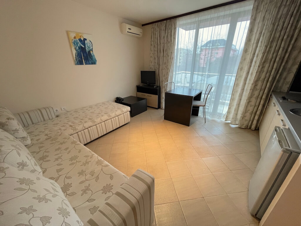 АН Lev&Mar Group предлагает потенциальным покупателям курортной недвижимости двухкомнатную квартиру в одном из самых лучших комплексов Солнечного берега. «Тарсис» построенном в 600 м от моря. На территории есть два бассейна, пиано-бар, ресторан, диско-клуб, супермаркет, салон красоты, рецепция, парковка, детская площадка с горками и качелями.