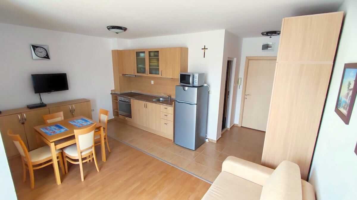 Новое предложение в Святом Власе! К продаже предлагается квартира – студия на третьем этаже в комплексе «Баттерфляй», Святой Влас. Пляж расположен на расстоянии 500 метров от территории комплекса. Планировка апартаментов включает прихожую, комнату с мини-кухней и спальным уголком, санузел и террасу с видом на горы. Кухня оборудована плитой, духовкой, холодильником и микроволновой печью. Есть современный телевизор. На территории комплекса расположены сезонный плавательный бассейн, сад и детская игровая площадка. Бесплатная парковка находится неподалеку.