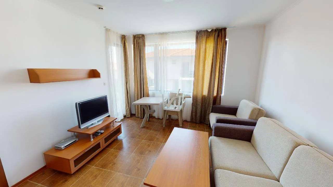 Новое, и уже готовое к приобретению предложение открыто в Кошарице! Уютная двухкомнатная квартира пополнила апартаментный фонд АН Lev & Mar Group. Она расположена в коттеджном поселке Бэй Вью Виллас, в экологически чистом, зеленом и уютном районе поселка. Это – апартамент, расположенный на втором этаже, из окон которого открывается великолепный вид на территорию комплекса и бассейн. Общая площадь составляет 67 кв. м. Мебель, техника и другие предметы интерьера в хорошем состоянии. Отличительной особенностью квартиры является наличие двух санузлов. Комплекс Бэй Вью Виллас функционирует круглогодично, управляющая компания обеспечивает транспортное сообщение с побережьем (до пляжа ездят маршрутные такси). На территории есть два бассейна, в числе которых один закрытого типа, СПА-центр, баня и сауна, ресторан, бар, супермаркет и фитнес-клуб. Предлагается служба проката велосипедов для прогулок по окрестностям. До Солнечного берега – три километра, до пляжа – чуть более четырех километров
