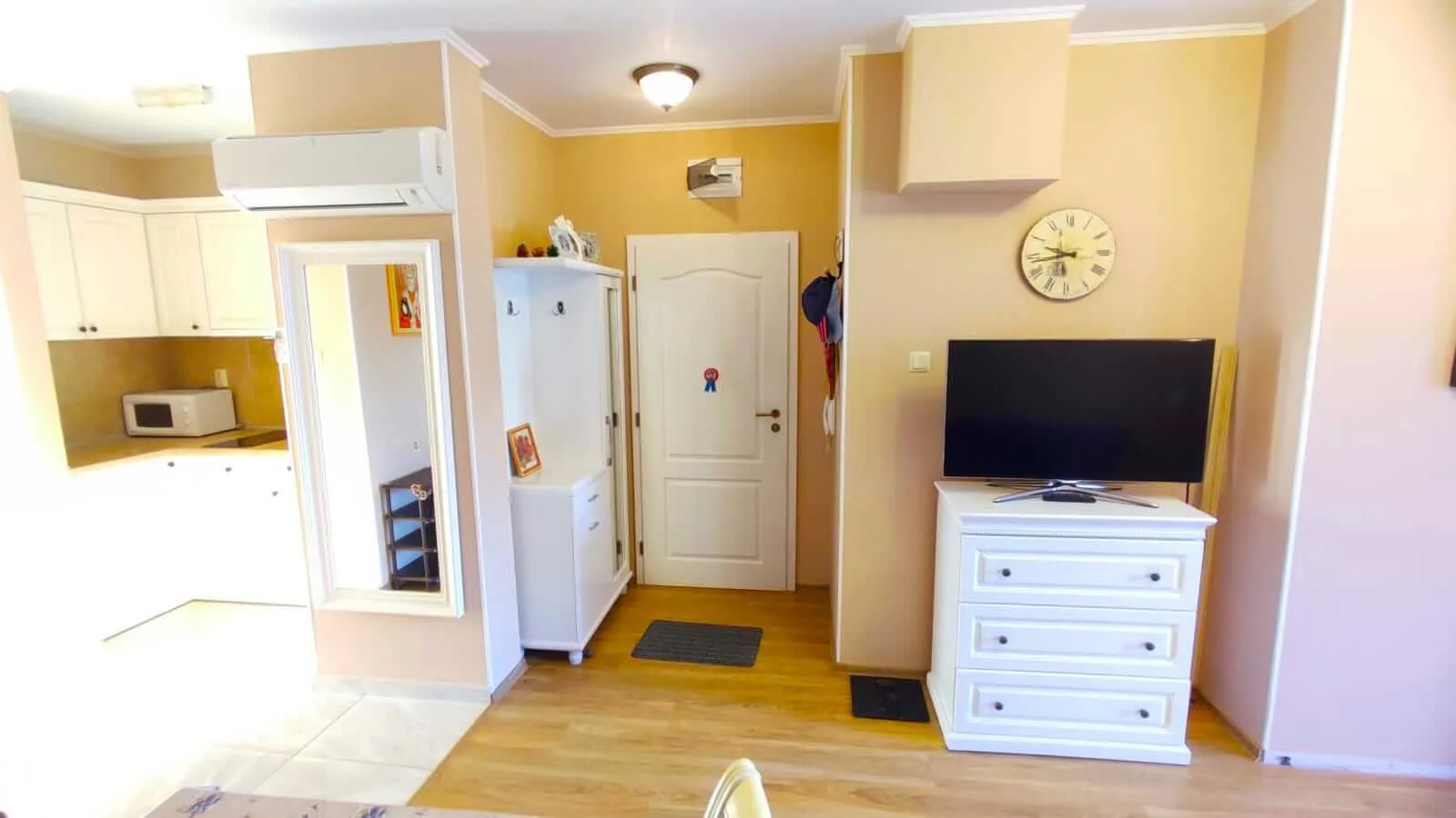 Изида Палас, комплекс, входящий в перечень самых роскошных на побережье Солнечного берега, уже в ближайшее время сможет стать вашим домом! В каталоге нашей компании пополнение – двухкомнатный апартамент с просторной планировкой и площадью, равной 60 м. кв. Это – квартира принципиально нового формата: со светлой гостиной, большой кухней, оригинальным интерьером и террасой с видом на бассейн. Третий этаж. Роскошь, комфорт и спокойствие – это далеко не все из того, что готов предложить ЖК Изида Палас своим жильцам. Состоящая из десятков удобств инфраструктура, круглогодичная работа, близость всех городских удобств и пляжа – в нескольких минутах ходьбы
