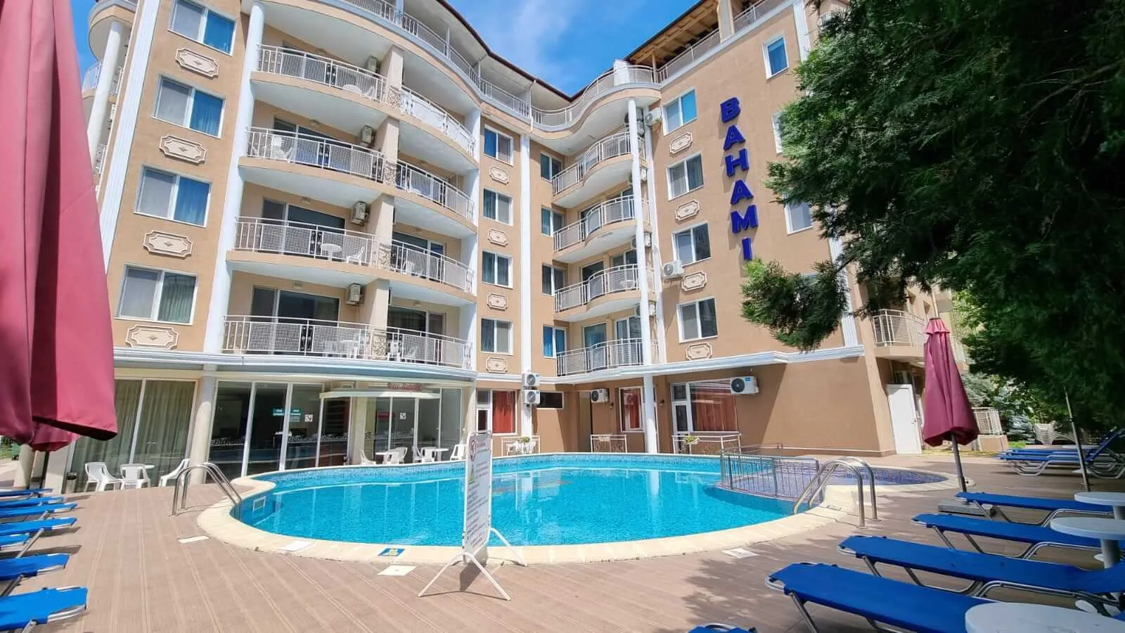 Если вы давно хотите приобрести квартиру в спокойном и тихом месте Солнечного берега, но в то же время с прекрасно развитой инфраструктурой, то у нас есть прекрасное предложение – квартира - студия в жилом комплексе «Бахами». Общая площадь 30,88 кв. м., с удобной планировкой. Прекрасно подойдет для проживания небольшой семьи. Важным достоинством является ее полная готовность к проживанию – наличие всей необходимой мебели и техники. За счет этого, она идеальным образом подойдет и для сдачи в аренду. Территория комплекса закрыта для посторонних. Есть своя парковка перед домом, бассейн с бесплатными шезлонгами и зонтиками. Отдельно хотелось бы отметить удобное расположение дома: до моря всего 500 м. Рядом рынок, остановка общественного транспорта, несколько продуктовых магазинчиков. До центра курорта не более пятнадцати минут пешком.