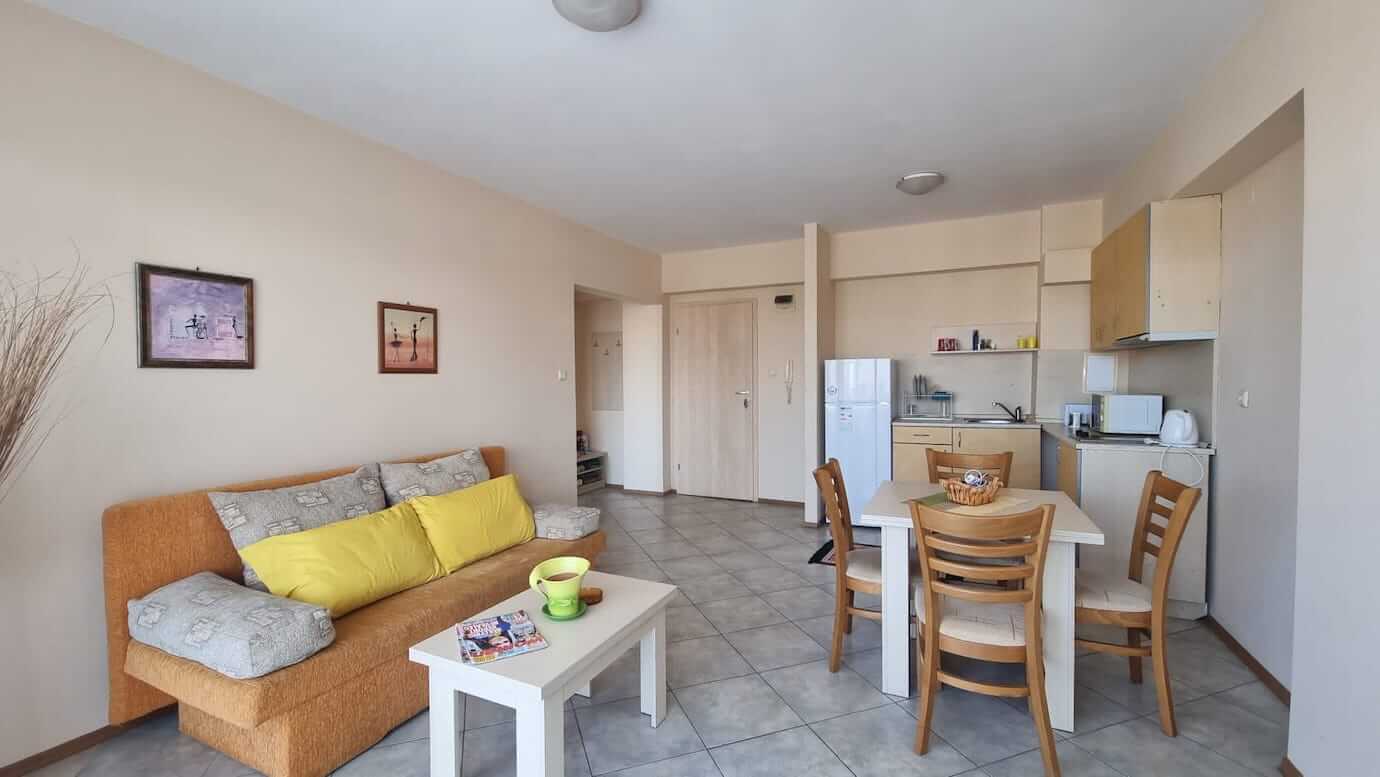 В апартаментном жилом комплексе Камелия Гарден, расположенном в одноименном квартале Камелия курорта Солнечный берег ! На четвертом этаже пятиэтажного дома в продаже двухкомнатный апартамент: достаточно просторная и хорошо оборудованная квартира. Общая площадь жилья – 63 м. кв. Красивая территория закрытого типа, большой бассейн прямо в центре двора, окруженный зоной, выделенной для загара и отдыха, автостоянка с охраной, магазины и заведения питания – эти удобства, как и часть других сервисных услуг, доступны всем жильцам комплекса. Преимущество ЖК в близости расположение к центру и к морю, а также в круглогодичном режиме работы