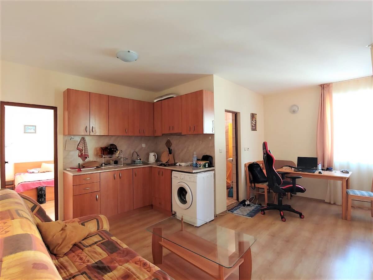 В 600 метрах от песчаного пляжа Солнечного берега, в курортном жилом комплексе Амадеус 5, продается меблированная и подготовленная к заселению новых собственников двухкомнатная квартира. Уютный и выходящий окнами на внутреннюю территорию апартамент находится на четвертом этаже, его площадь, составляющая 66 кв. м., распределена на просторную кухонно-гостевую зону, уютную спальню, балкон и санузел. Все пространство меблировано. Амадеус 5 – это популярный среди покупателей и отдыхающих апартаментный отель, который находится в 600 метрах от пляжа и примерно на том же расстоянии от центра курорта. Его внутренняя территория представлена плавательным бассейном, бесплатной автостоянкой и зоной для отдыха. В семистах метрах аквапарк Экшн и развлекательный клуб Кубань, в радиусе пяти минут ходьбы много ресторанов и супермаркетов: Джанни, ММ, Младость и другие