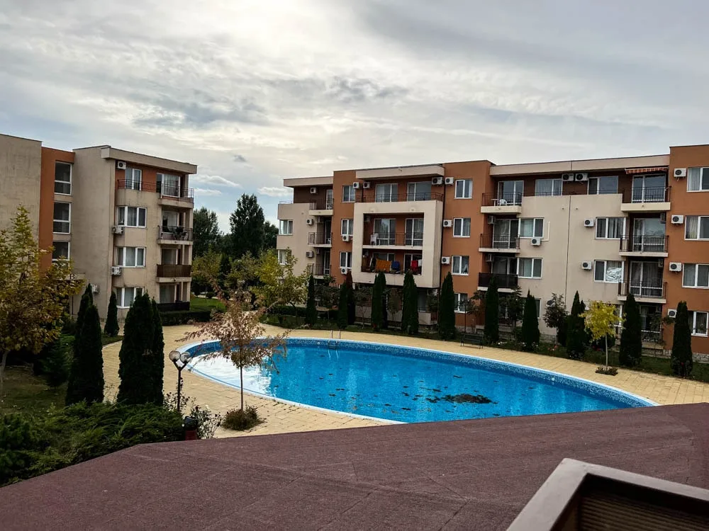 Наше агентство радо предложить Вам к приобретению двухкомнатную квартиру, расположенную на 2-м этаже в комплексе Holiday Fort Club на Солнечном Берегу. Комплекс находится в непосредственной близости от аквапарка и предлагает круглогодичную охрану и обслуживание. На территории комплекса располагаются 9 бассейнов для взрослых и детей, 2 водные горки, 2 ресторана, гольф-клуб, супермаркет, бесплатную парковку, теннисное/футбольное поле и многое другое. Комплекс сам по себе является мини курортом. Он открыт круглый год и подходит как для постоянного проживания, так и для отдыха и сдачи в аренду. К продаже предлагается двухкомнатная квартира общей площадью 65 кв.м. из них 56,19 кв.м. являются чистой жилой площадью и 6,11% являются идеальными частями общих частей здания. Квартира состоит из: просторной гостиной с кухней и обеденной зоной, балкона с видом на бассейн, одной спальни и ванной комнаты с душевой кабиной, туалетом, раковиной и стиральной машиной. Квартира продается с мебелью и оборудованием, как на фотографиях