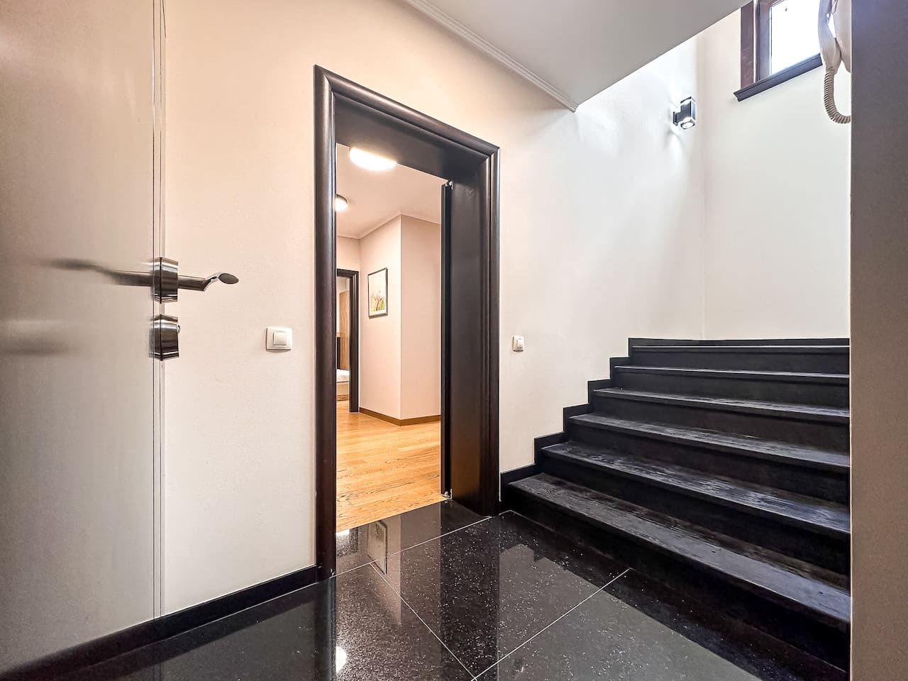 Мы поднимаемся лифтом прямо в квартиру — да, в этой квартире есть свой личный выход из подземного паркинга. Уже на входе ощущается особая энергетика: спокойствие, простор, благородство материалов.