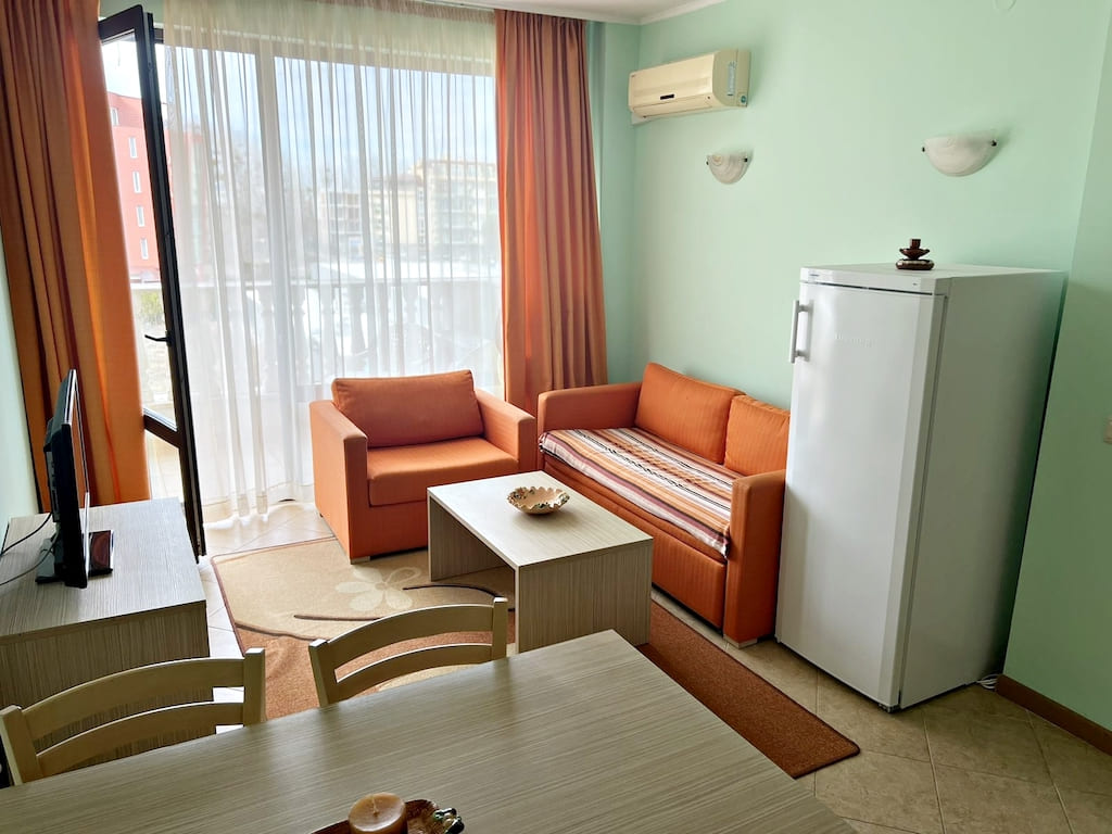 АН Lev & Mar Group предлагает Вашему вниманию прекрасный вариант приобретения недвижимости на курорте Солнечный берег - компактную, светлую и полностью меблированную двухкомнатную квартиру в апарт-отеле Royal Sun. Этот апарт-отель расположен всего в 300 метрах от моря, что делает его идеальным местом для отдыха и проживания. Квартира находится на четвертом этаже и имеет общую площадь 56 кв.м. С террасы открывается вид на прилегающую улицу. Отопление осуществляется с помощью кондиционера. Стоимость таксы поддержки составляет 12€/кв.м в год. Одним из главных преимуществ данного объекта является его расположение в апарт-отеле Royal Sun. Здесь предусмотрены все необходимые условия для комфортного отдыха и проживания. Уникальный парк площадью в 10000 кв.м с детской площадкой, три бассейна (включая детский), площадью более 1000 кв.м, ресепшн, консьерж-сервис и лобби-бар - всё это доступно для гостей и жильцов апарт-отеля. Кроме того, имеется ресторан и коктейль-бар, СПА-центр с массажем, джакузи, сауной и солярием, фитнес-центр, медицинский центр, супермаркет и магазины. Круглосуточная охрана и видеонаблюдение обеспечивают безопасность жильцов. Техническое обслуживание и уборка осуществляются регулярно. Приобретение данной квартиры - отличная инвестиция в комфортное и безопасное проживание или сдачу в аренду на популярном курорте Солнечный берег. Не упустите свой шанс стать обладателем этой уникальной недвижимости!