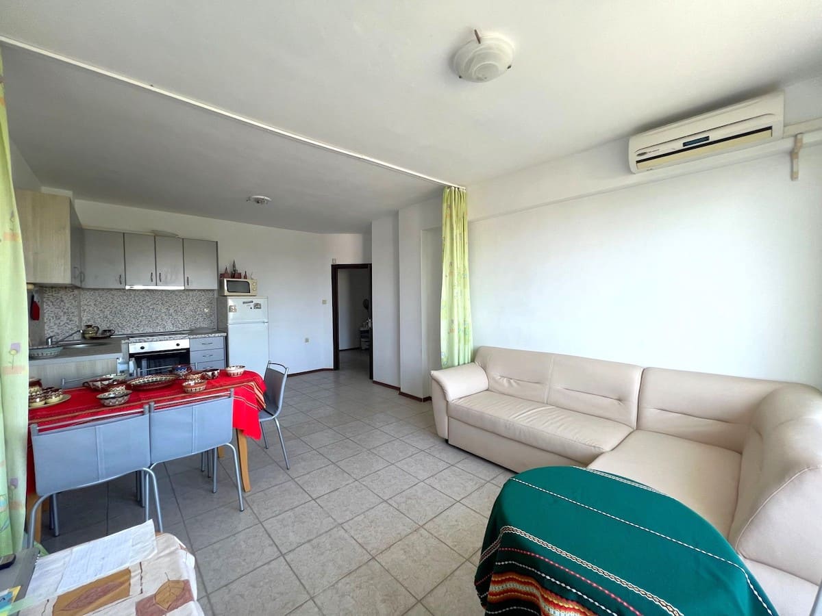 Добро пожаловать в наше агентство недвижимости на Солнечном берегу - вашему источнику превосходных обьектов недвижимости предлагаемых к продаже! Мы рады представить вам наше новое предложение, которое наверняка заинтересует Вас. Великолепная 2-х комнатная квартира площадью 71 квадратный метр расположена на четвертом этаже в Жилом Комплексе SUNNY GARDENS, всего в 400 метрах от прекрасного песчаного пляжа и лазурного моря. Это идеальное место для тех, кто мечтает о непревзойденном ПМЖ, семейном летнем отдыхе или успешных инвестициях. При входе в квартиру вас встретит просторная гостиная, создающая уютную и расслабляющую атмосферу. Кроме того, современная кухня предлагает идеальное пространство для творчества и приготовления невероятных кулинарных шедевров. Однако настоящей жемчужиной этой квартиры является санузел, где установлена элегантная душевая кабина. Вы сможете наслаждаться роскошью и комфортом каждый день, окунувшись в расслабляющий душ после долгого дня на солнце. Жилой Комплекс SUNNY GARDENS также предлагает вам дополнительные преимущества. УК взымает таксу поддержки, по цене всего 8€ за квадратный метр в год. Это означает, что вы можете быть уверены в безупречной поддержке и комфорте комплекса. Не меньшее значение имеет и вид с просторной террасы этой квартиры. Вы сможете наслаждаться живописными пейзажами курорта, восхищаясь красотой окружающей природы, в то время как солнечные лучи согревают вас и подарят вам бесценные моменты спокойствия. Так что, если вы ищете недвижимость, сочетающую в себе стиль, комфорт и возможности инвестирования, эта 2-х комнатная квартира в ЖК SUNNY GARDENS - идеальный вариант для вас. Обратитесь к нам прямо сейчас, чтобы узнать больше о возможностях приобретения этой уникальной недвижимости. Мы готовы помочь вам осуществить вашу мечту о жизни на Солнечном берегу!