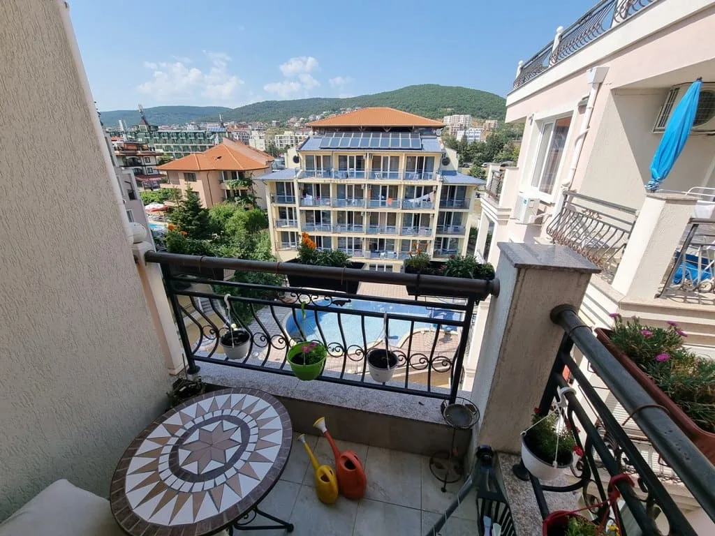 Небольшой балкончик, где можно расслабиться с чашечкой кофе, наслаждаясь видом на бассейн и горы.