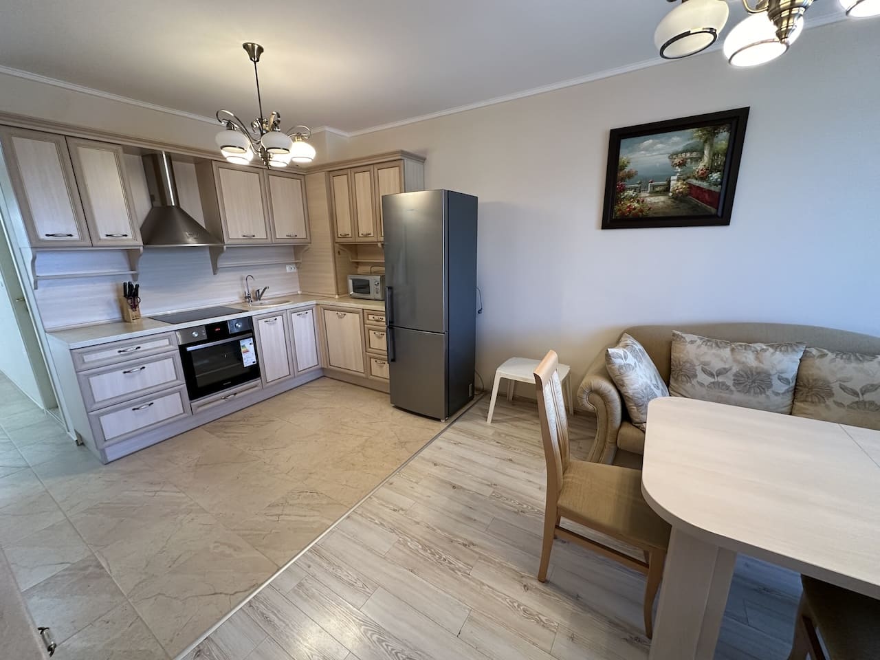 Просторная гостиная, совмещающая в себе кухню, столовую и зону отдыха, где вы сможете собираться всей семьей за уютными ужинами и делиться впечатлениями от насыщенного дня.