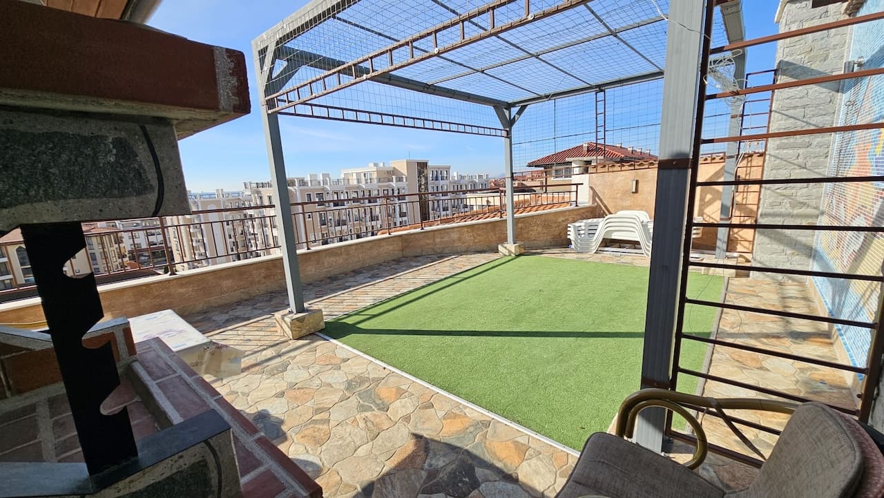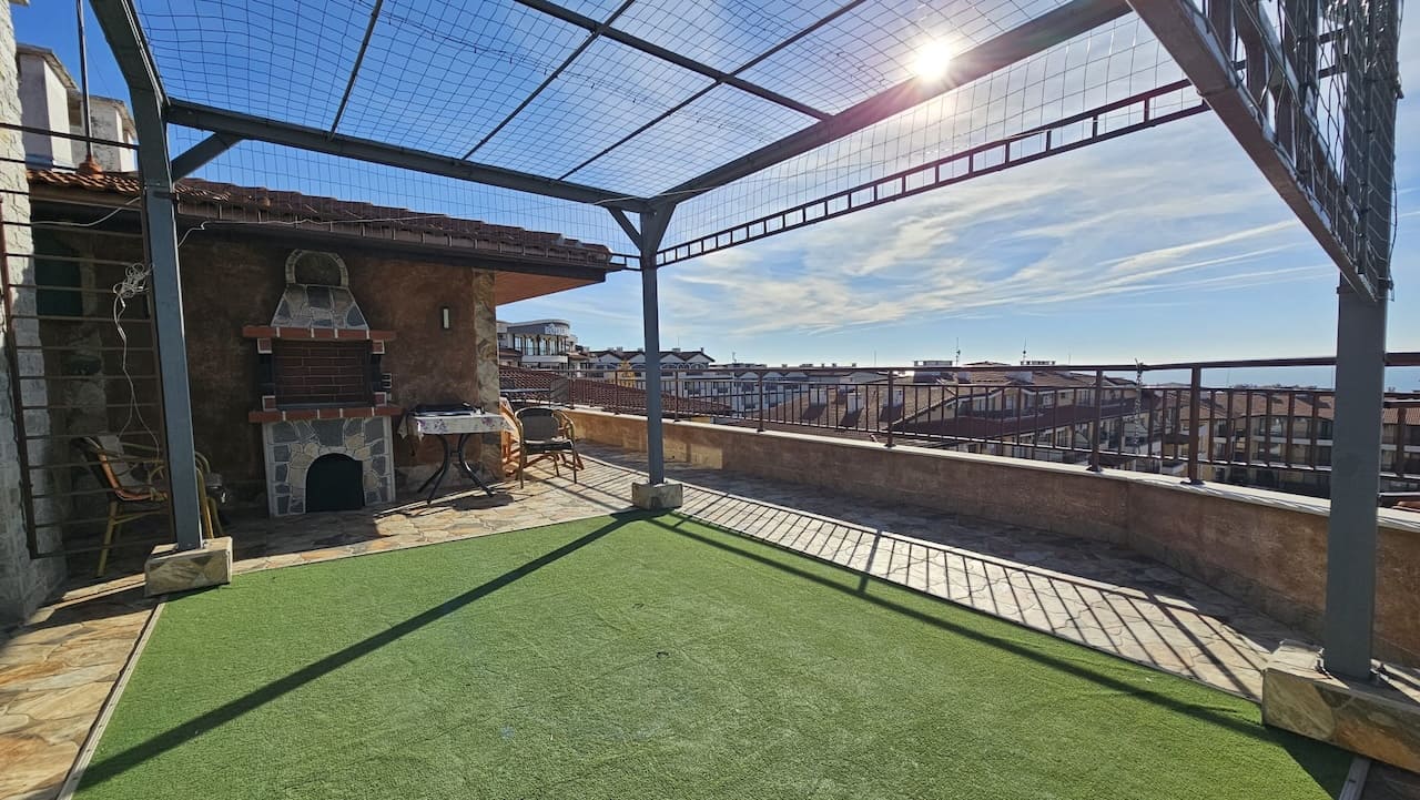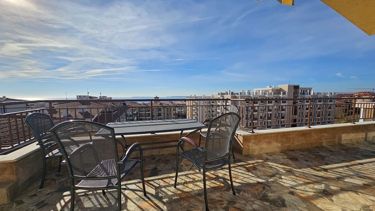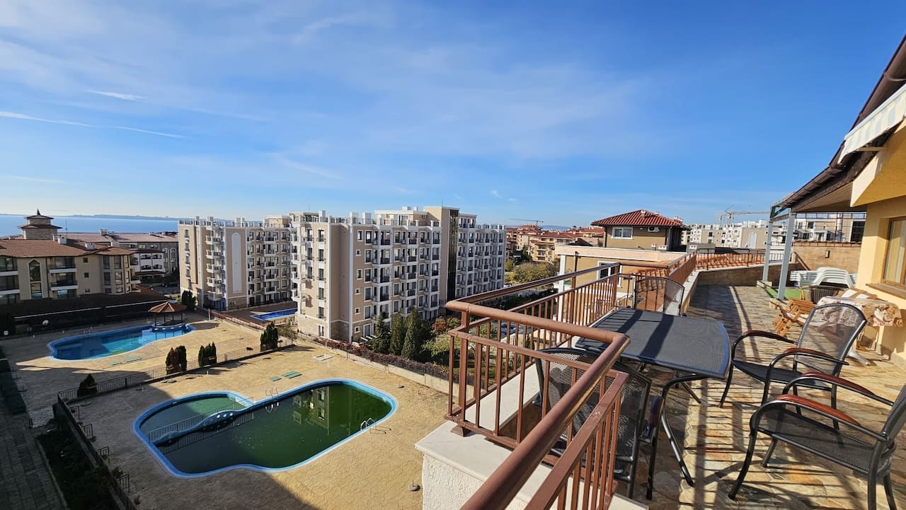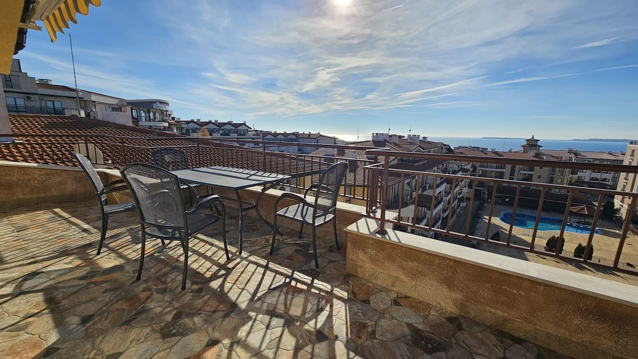 Предлагаем к продаже двухкомнатную квартиру общей площадью 78,56 кв.м, расположенную на третьем этаже жилого комплекса Дольче Вита 2 в курортном городе Святой Влас. Апартамент состоит из просторного коридора, гостиной с функциональным зонированием (кухня, столовая и зона отдыха), одной спальни, двух санузлов и террасы с панорамным видом на море. Терраса оборудована мебелью для отдыха и зоной для барбекю, что делает её идеальным местом для наслаждения морскими пейзажами и свежим воздухом.