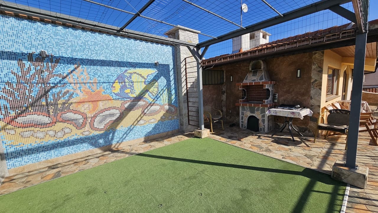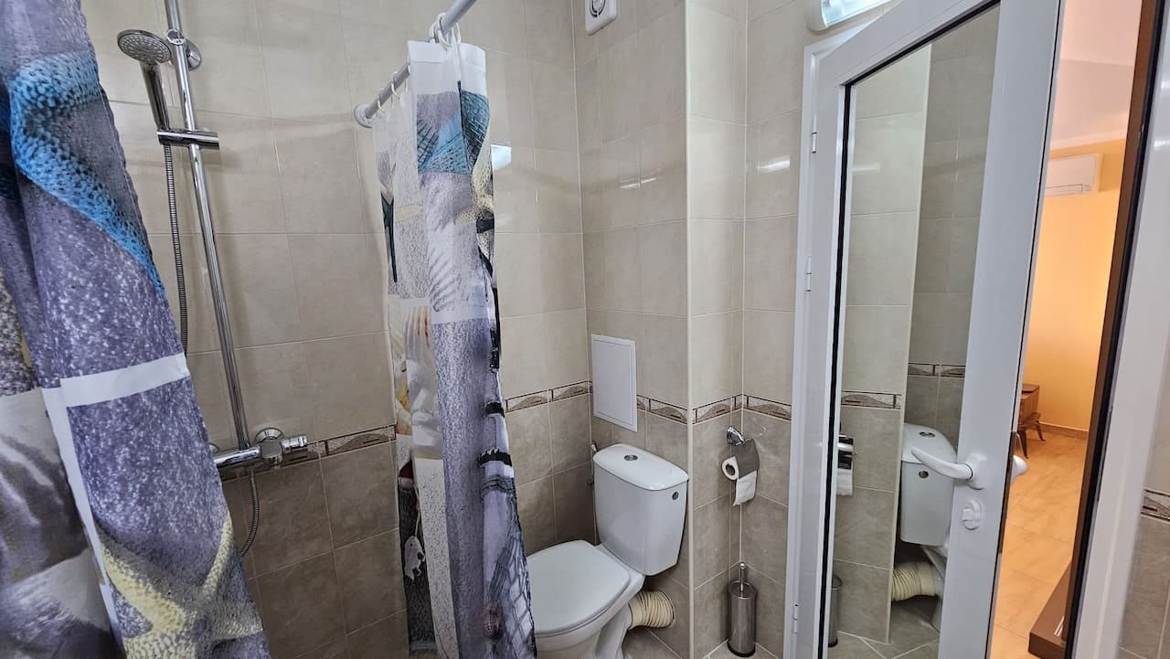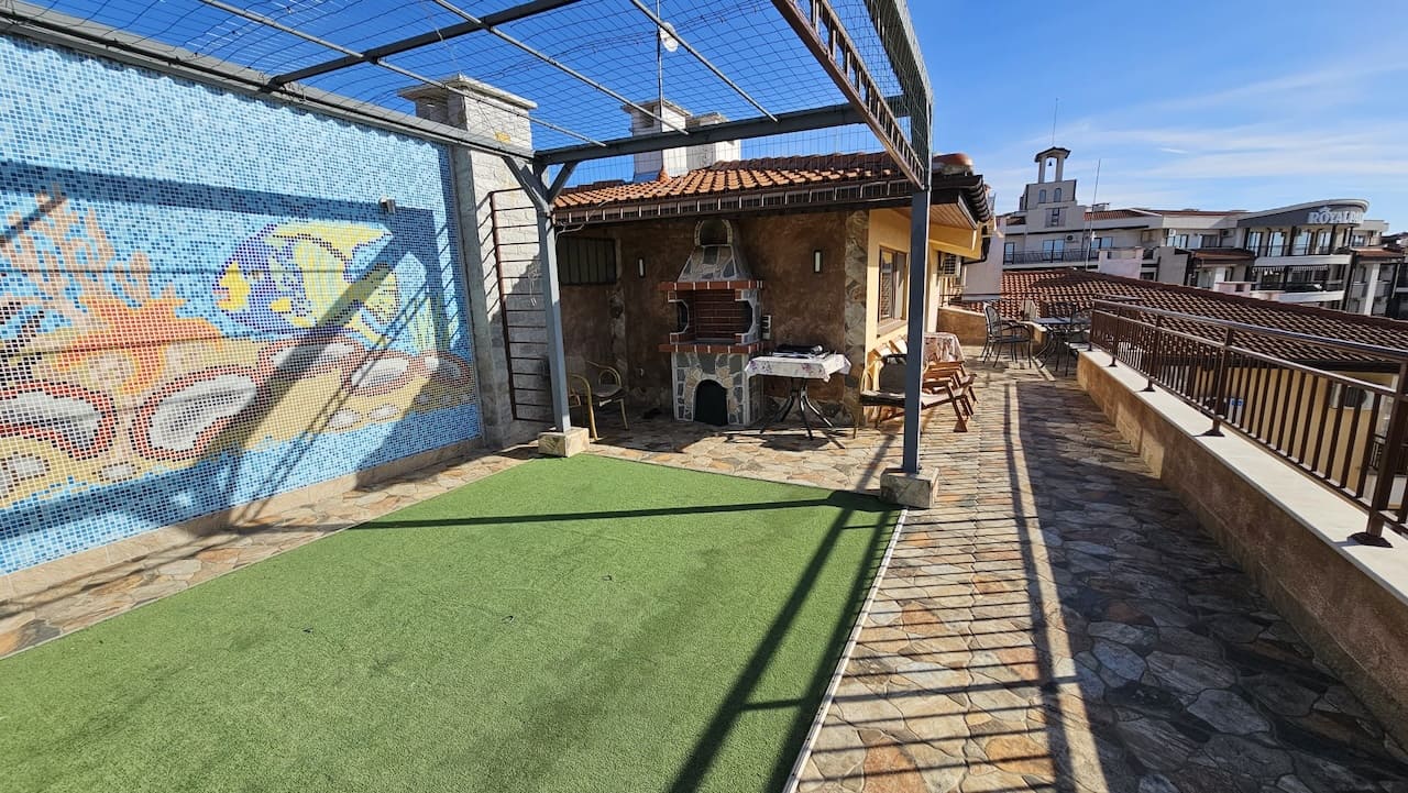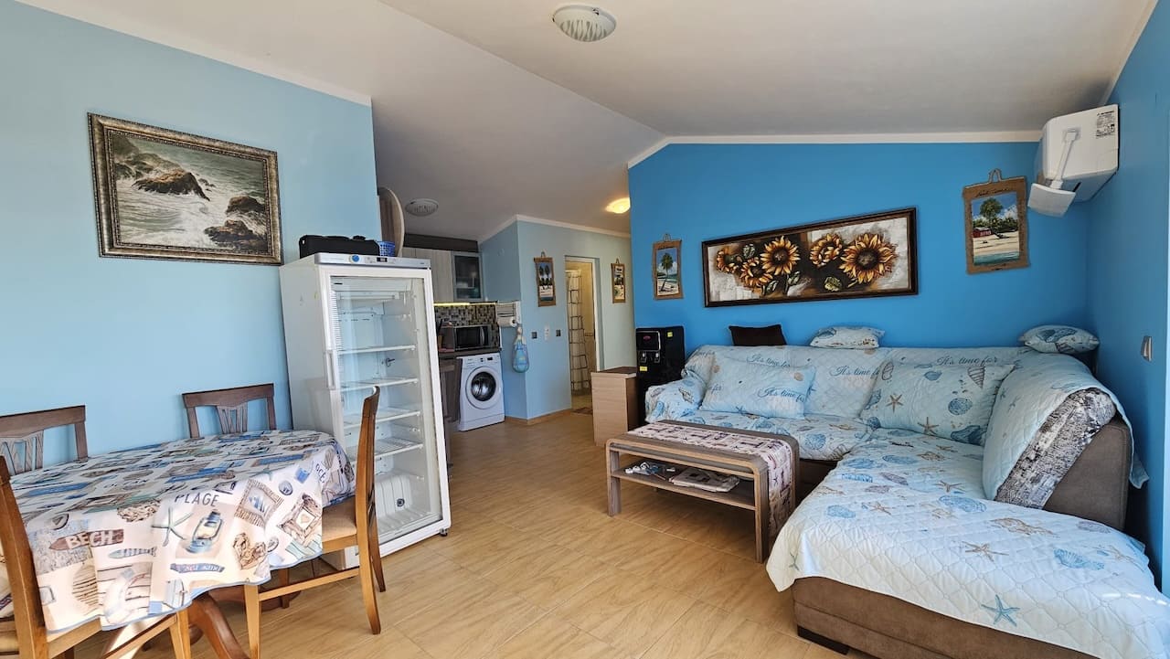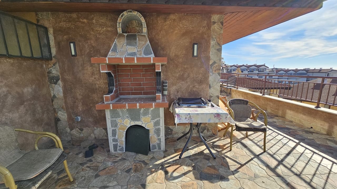 Предлагаем к продаже двухкомнатную квартиру общей площадью 78,56 кв.м, расположенную на третьем этаже жилого комплекса Дольче Вита 2 в курортном городе Святой Влас. Апартамент состоит из просторного коридора, гостиной с функциональным зонированием (кухня, столовая и зона отдыха), одной спальни, двух санузлов и террасы с панорамным видом на море. Терраса оборудована мебелью для отдыха и зоной для барбекю, что делает её идеальным местом для наслаждения морскими пейзажами и свежим воздухом.