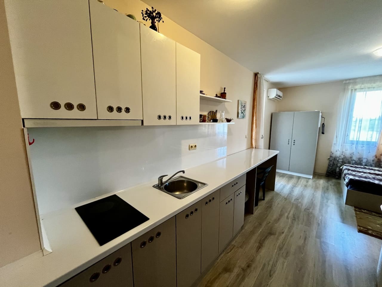 На границе старинного Несебра и курортной Равды, среди цветочных аллей и клумб, в морском воздухе и покое, расположился жилой комплекс Apollon 9 — место, где нет спешки. Именно здесь, на третьем этаже одного из корпусов, находится светлая студия площадью 35 м² — идеальный вариант для тех, кто ищет комфорт у моря.
