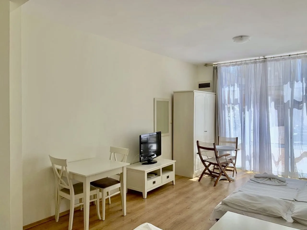 Когда с утра ☀ солнце заливает комнату мягким светом, а вы, босиком, выходите на террасу с чашкой кофе и слышите плеск воды в бассейне — именно так начинается день в этой уютной студии в ЖК Flores Park, в самом сердце Солнечного берега.