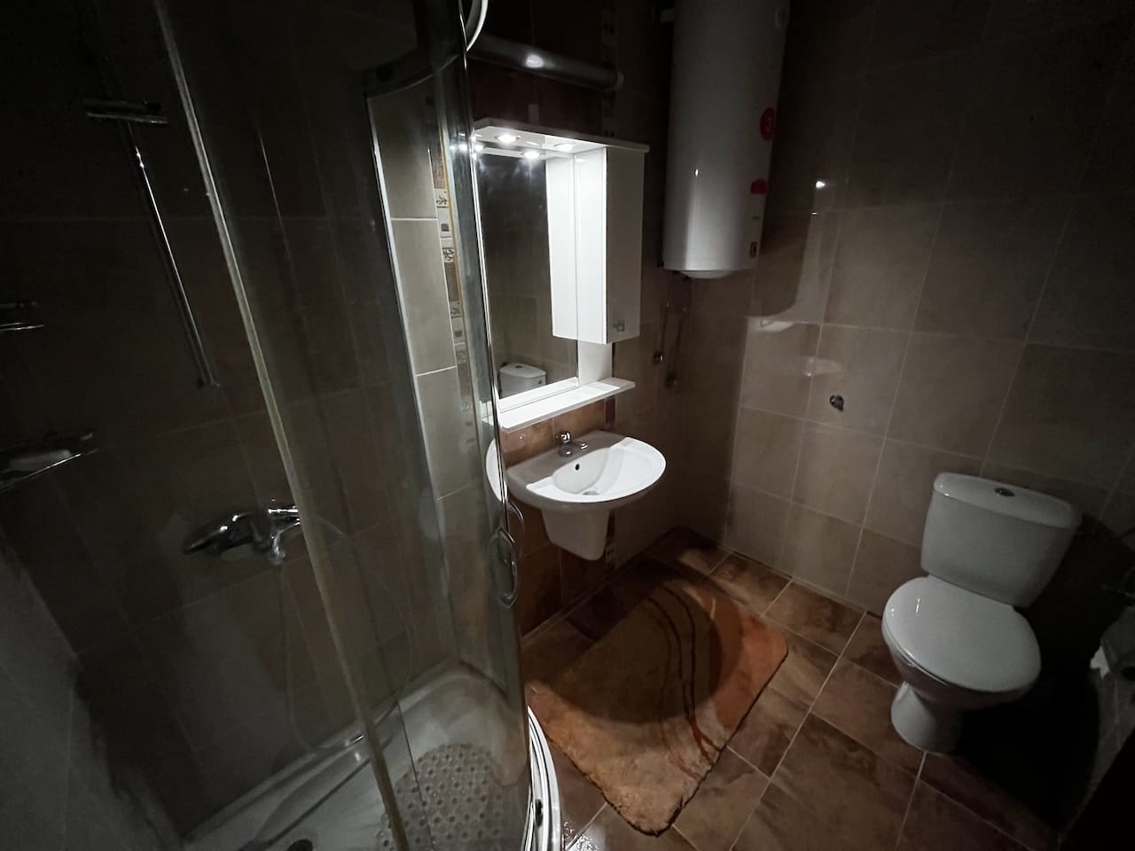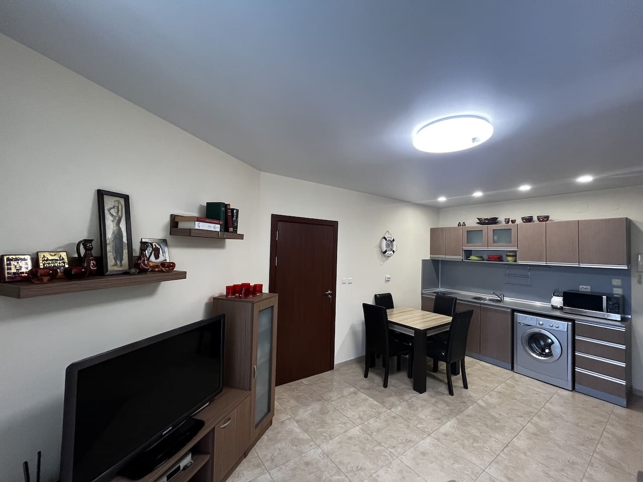 Всё оформлено в приятной светлой палитре, с качественной керамической плиткой на полу.