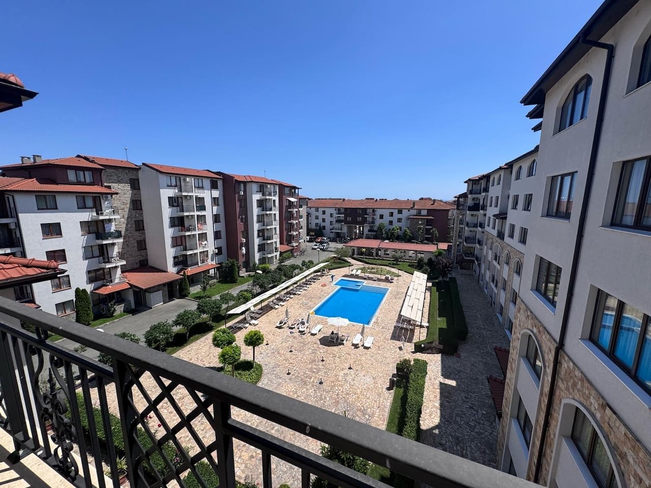 Представьте себе утро, где вместо суеты — тёплое солнце, зелёные луга и лёгкий ветер с моря. Вы выходите на одну из террас, чувствуете аромат трав, слышите пение птиц и понимаете: вы дома. А с другой стороны — вид на бассейн, искры света на воде и запах кофе с террасы кафе комплекса. До пляжа — около 300 метров, можно дойти босиком.