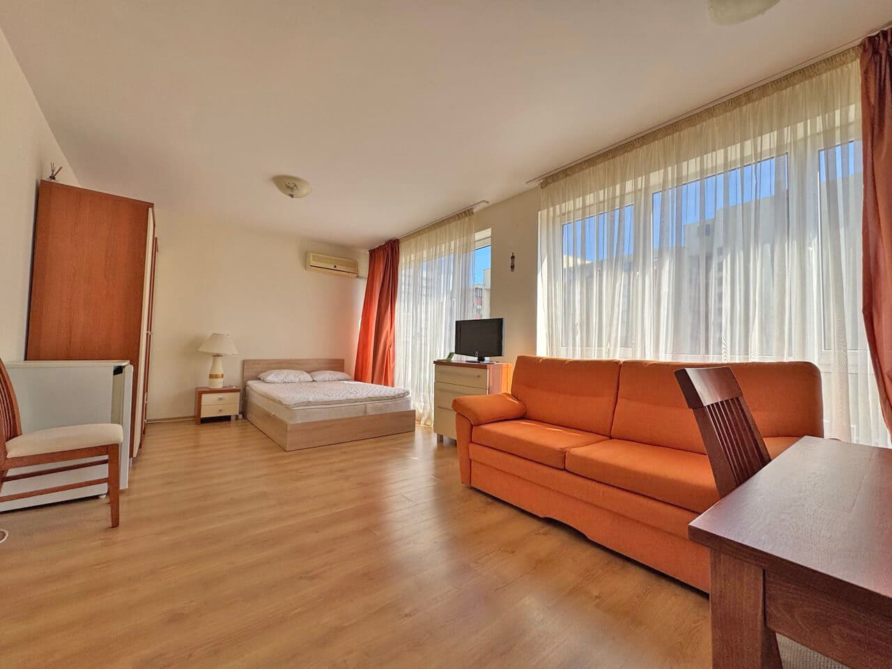 Утреннее солнце заливает комнату мягким светом. Вы открываете окно — и вас встречает свежий морской воздух и город, ещё только просыпающийся. Именно такое ощущение свободы и простора даёт эта студия площадью 42 м² в комплексе Flores Park, расположенном в сердце Солнечного Берега, всего в 5 минутах от пляжа. 🌊