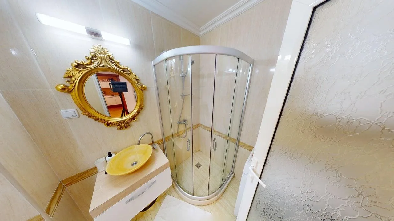 Спальня изолированная, с хорошим естественным светом. Санузел оборудован душевой кабиной и выглядит аккуратно, без следов износа. С террасы открывается вид на соседний комплекс — без шумных дорог под окнами.