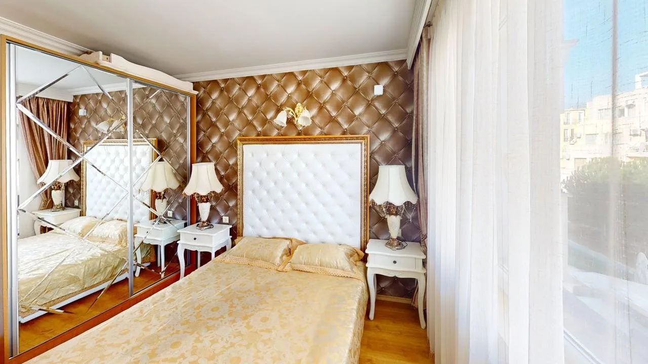Центральная часть Солнечного Берега. До пляжа — спокойная прогулка 10–12 минут. Рядом магазины, кафе, пекарни, рестораны, аптеки и крупный аквапарк.