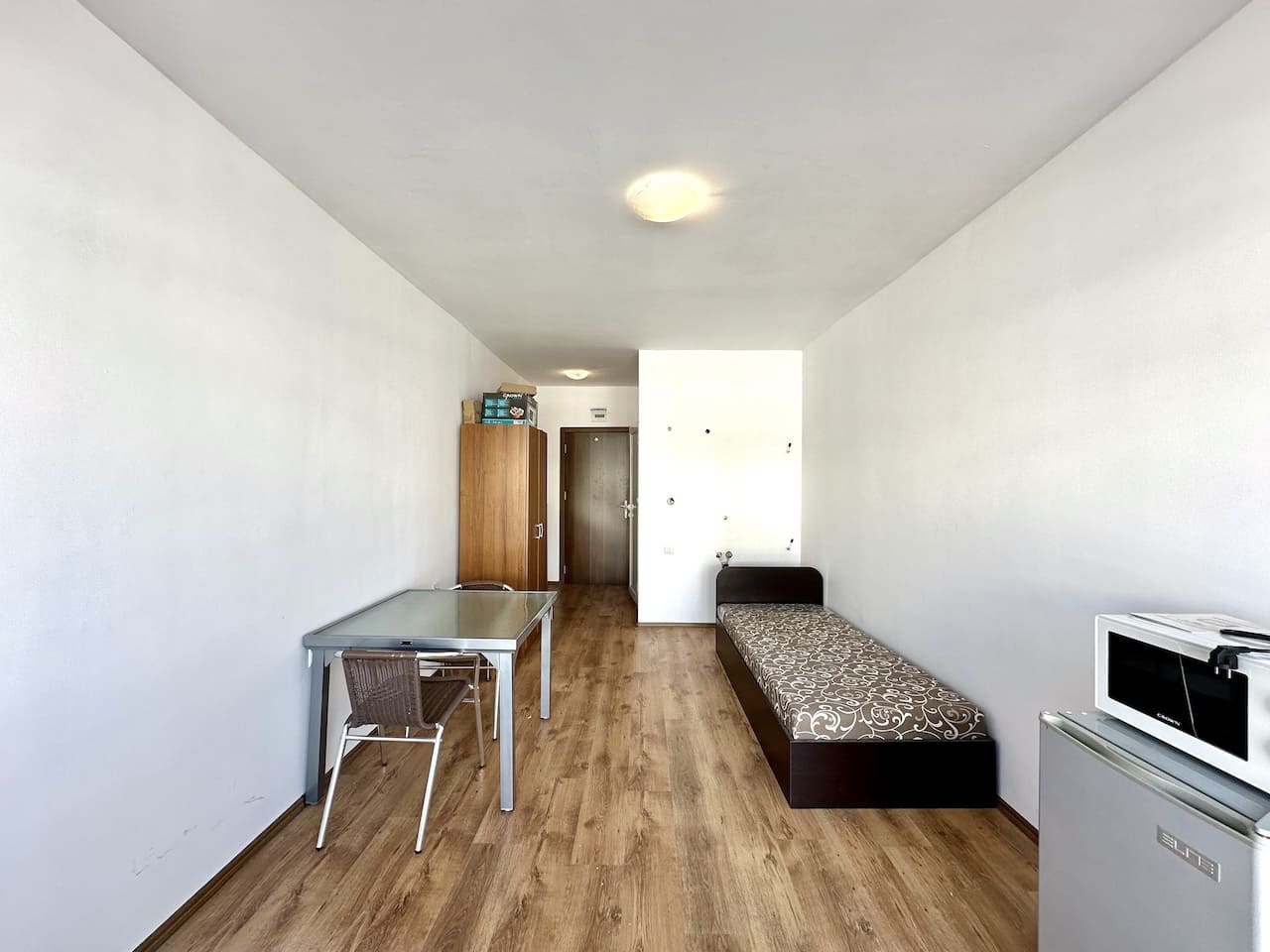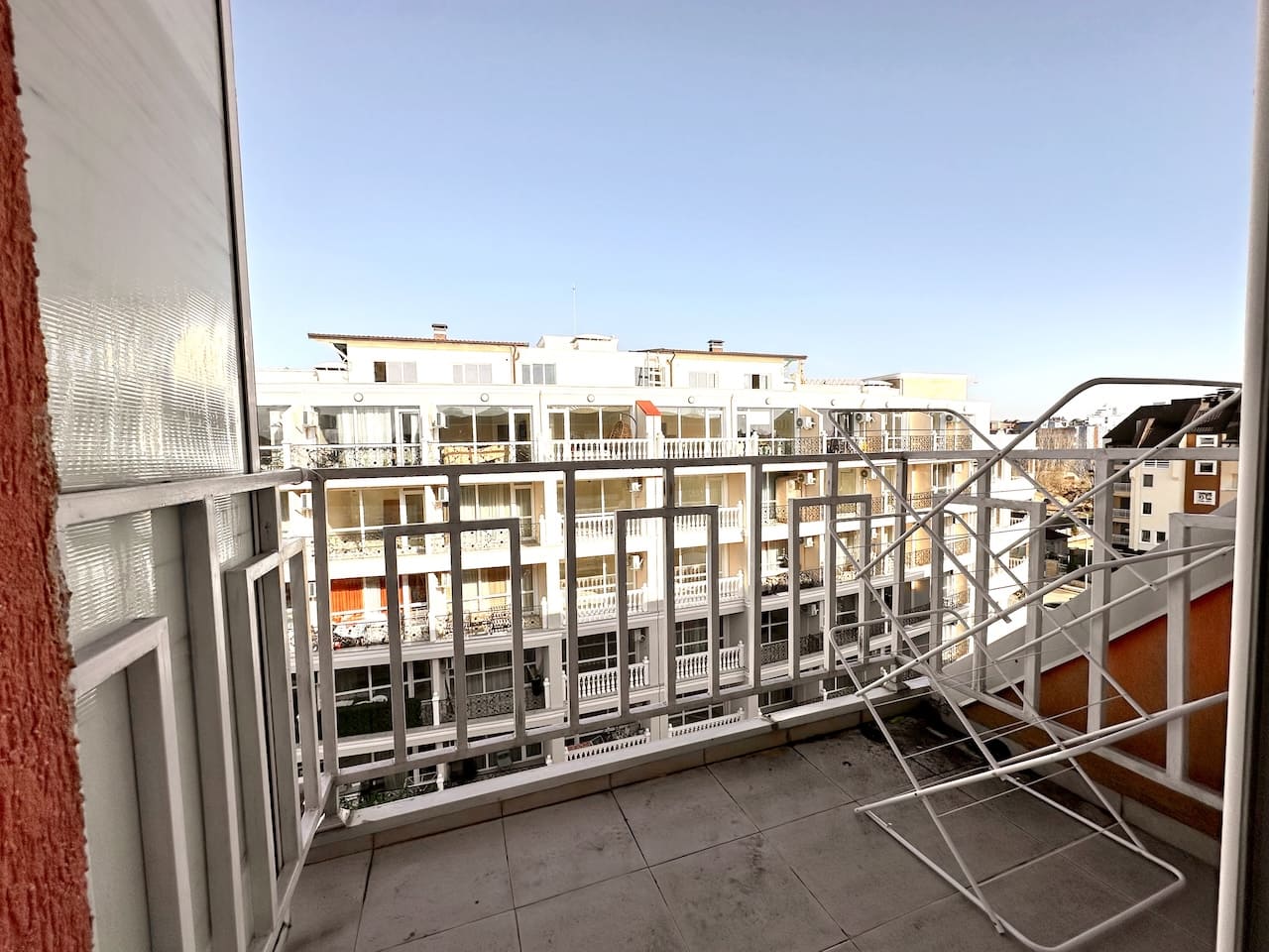 Квартира предлагается к продаже частично меблированной. Установлены кровать, шкаф, обеденный стол со стульями, холодильник, кондиционер. Кухонный блок отсутствует, и этот момент важно проговорить сразу. С одной стороны, это дополнительные затраты. С другой — новый собственник не переплачивает за чужие компромиссные решения. Для агентства такой формат — скорее плюс, если квартира приобретается не «на один сезон», а с расчётом на долгосрочное использование: кухню можно сразу спроектировать под нужный сценарий — компактную для аренды или более функциональную для постоянного проживания.