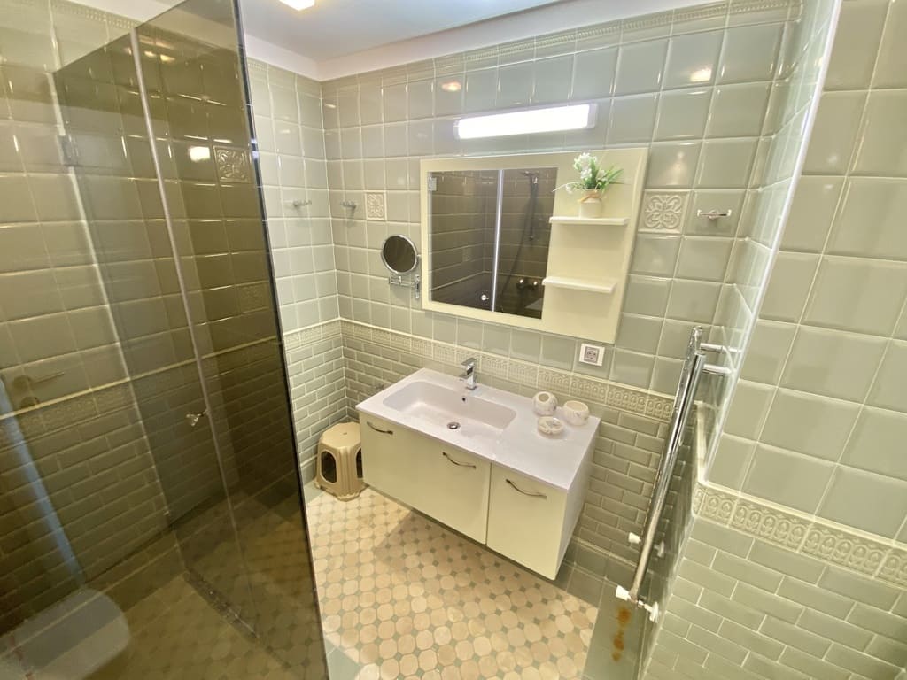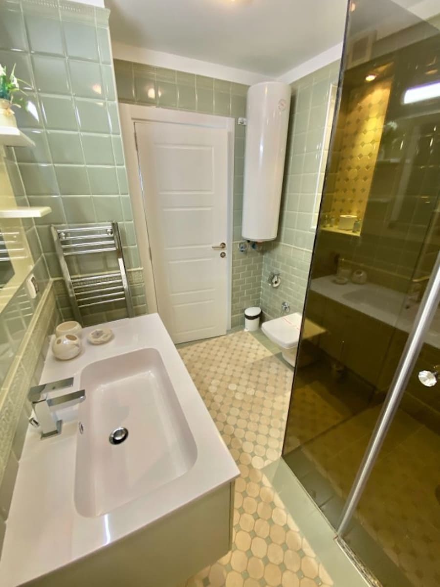 Две спальни изолированы, обе с полноценными размерами и спокойной геометрией. Два санузла с душевыми кабинами решают бытовые вопросы без компромиссов. В отделке использован итальянский фаянс — не как декларация, а как надёжная и долговечная база.