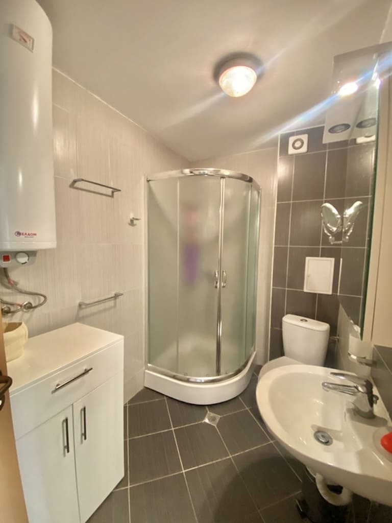 Квартира находится в хорошем состоянии. Установлен кондиционер, подключены интернет и телевидение — заехать и пользоваться можно сразу. Санузел оборудован душевой кабиной и выполнен аккуратно, без визуального шума и лишних деталей.