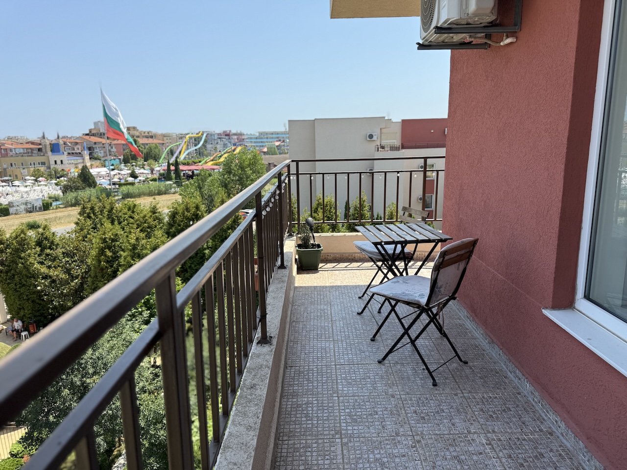 Комплекс расположен в западной, более спокойной части Солнечного Берега — примерно 15 минут пешком до моря и пляжа. Меньше шума, более ровный ритм и удобный доступ к центру курорта.