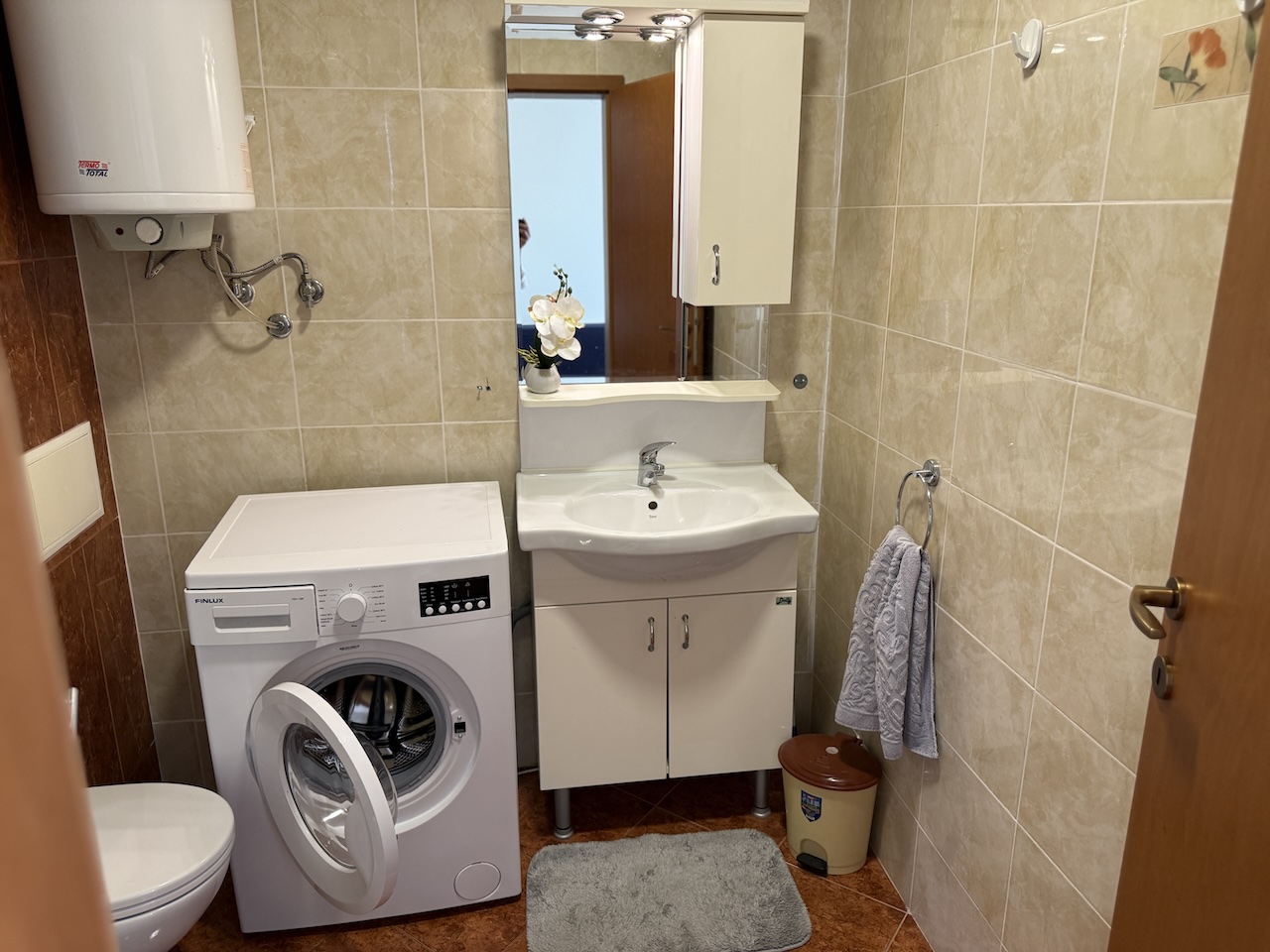 Санузел оборудован душевой кабиной, установлен бойлер и стиральная машина. Есть кондиционер ❄️, интернет и телевидение. Состояние — хорошее, без необходимости срочных вложений.