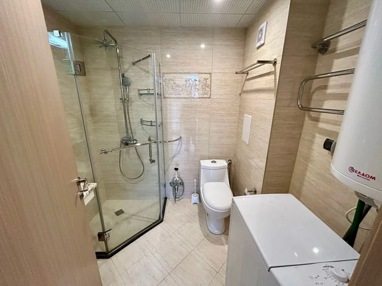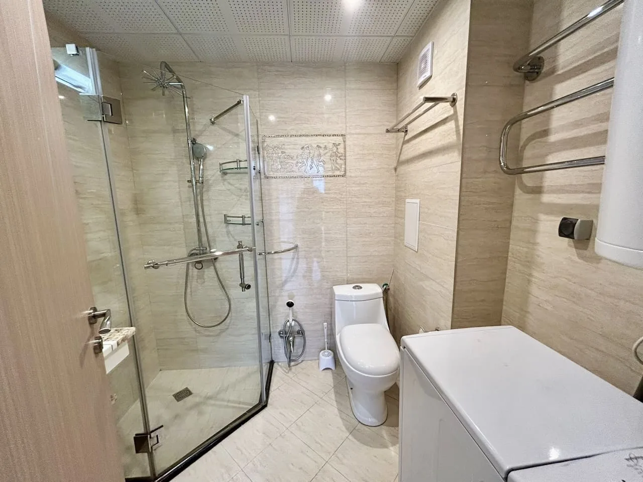 Спальня отдельная, с полноценной кроватью и системой хранения. Санузел оборудован душевой кабиной. Техника, кондиционеры, мебель — всё уже установлено.
