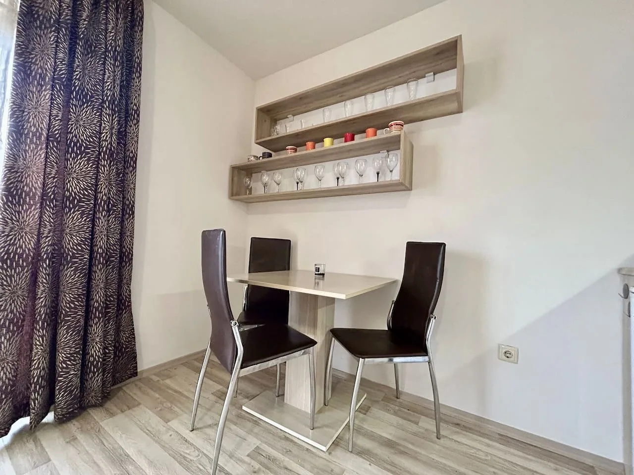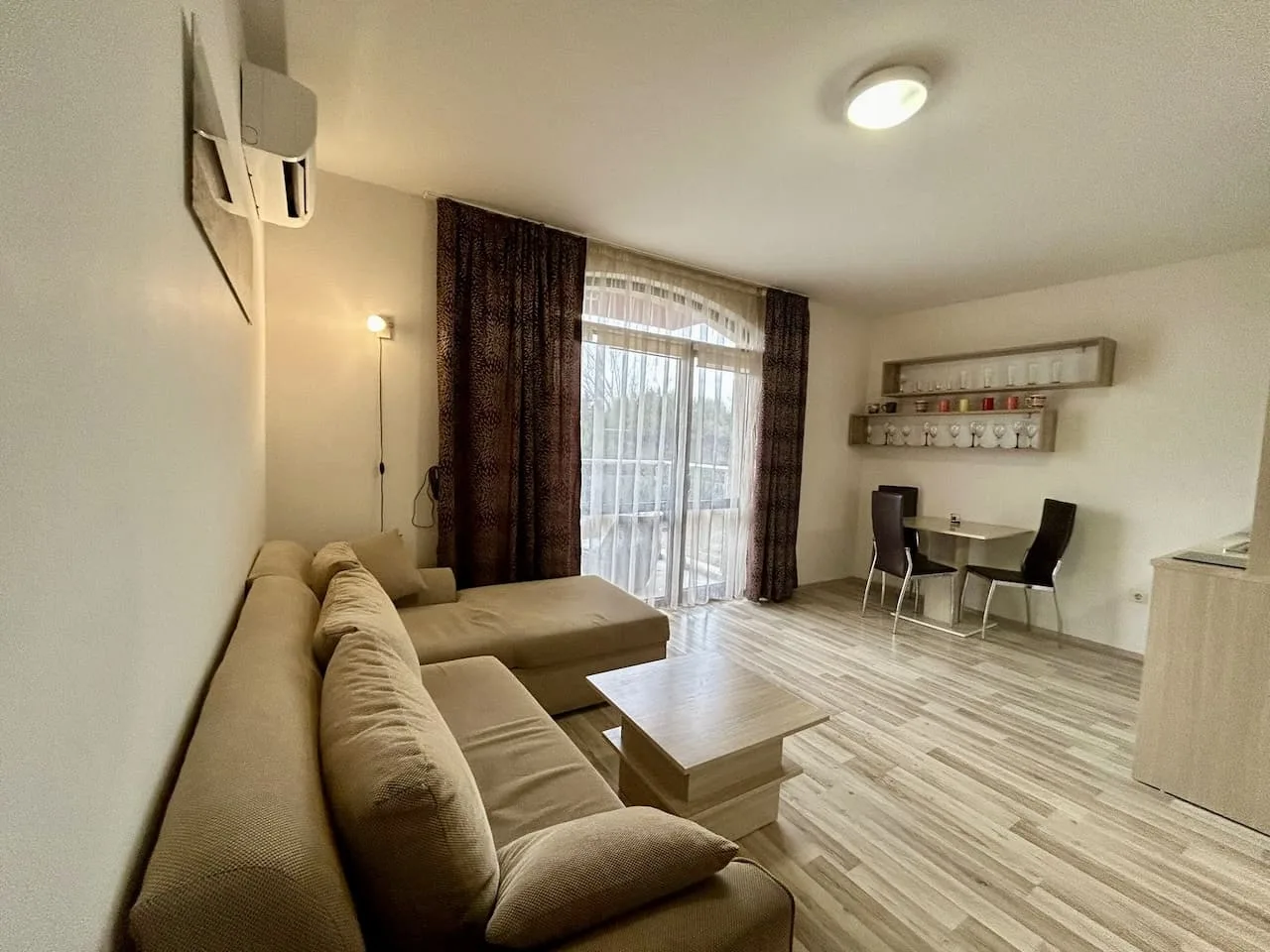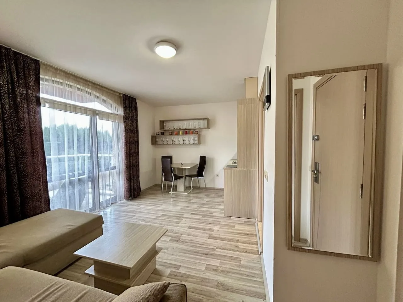 Этот апартамент площадью 43,12 м² расположен на первом этаже комплекса Tarsis 2 — части проекта «Тарсис Клуб & СПА», в юго-западной, более спокойной части Солнечного берега.
