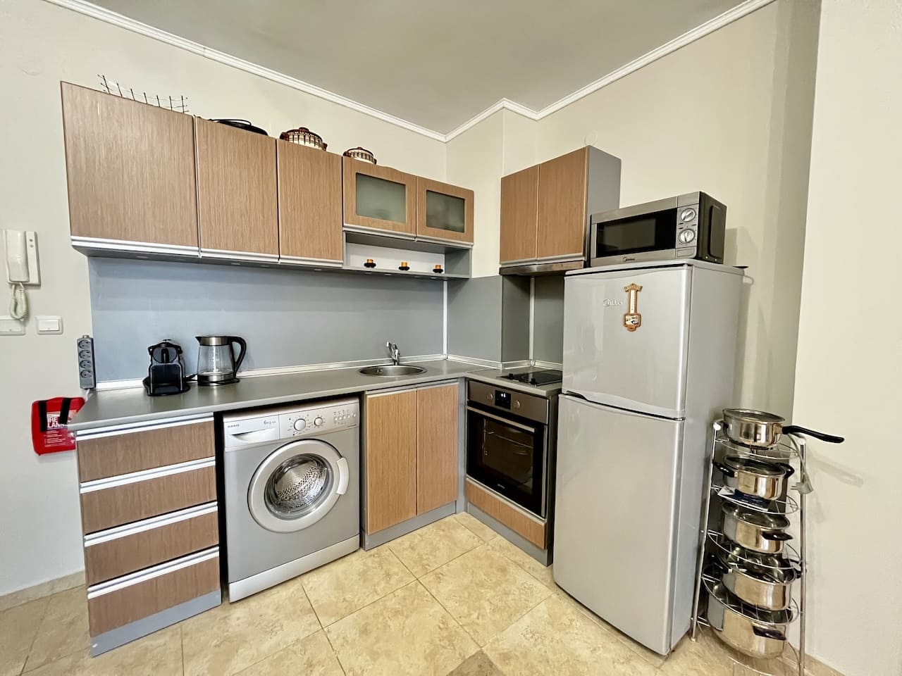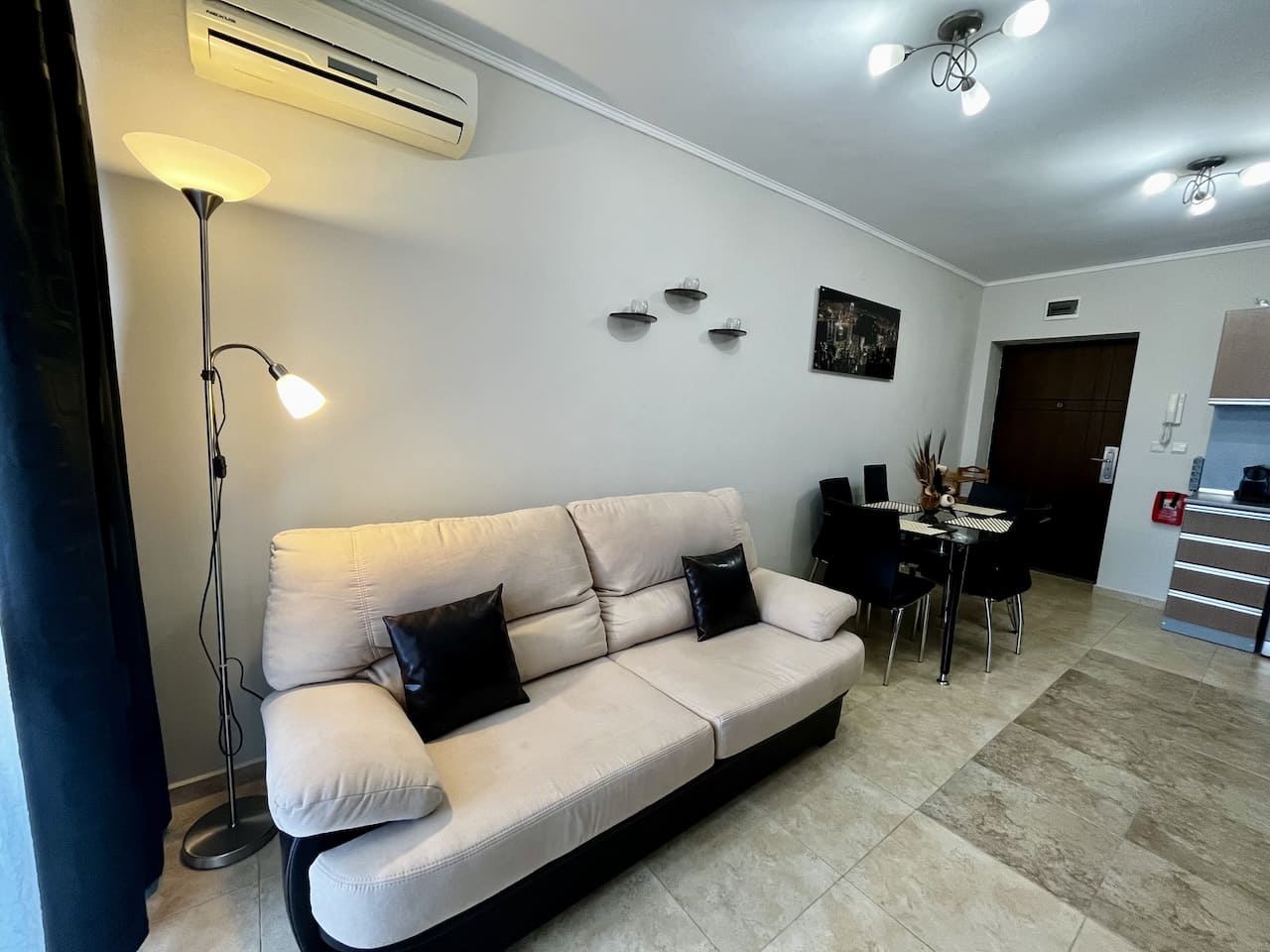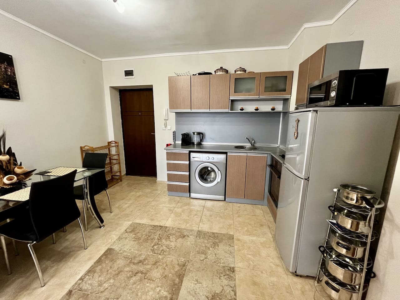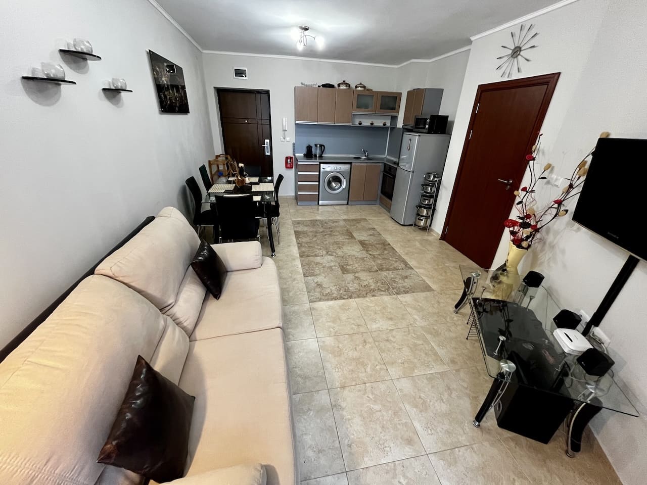 Гостиная организована так, как удобно для повседневной жизни. Кухонный блок оборудован техникой, есть стиральная машина, холодильник, варочная панель, духовой шкаф. Обеденная зона отделена от зоны отдыха, где установлен диван и телевизор 📺. В помещении установлен кондиционер, подключены интернет и телевидение.