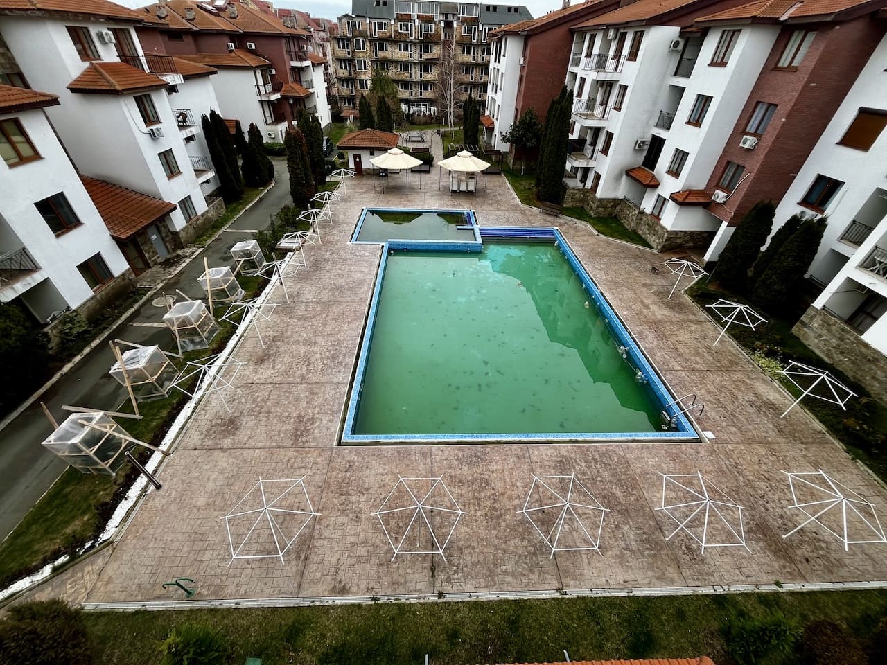 Во внутреннем дворе расположен сезонный бассейн с детской зоной 🏊. Летом устанавливаются шезлонги и зонтики, работает бар. Есть детская площадка. Рядом — бесплатная парковка для собственников и гостей.